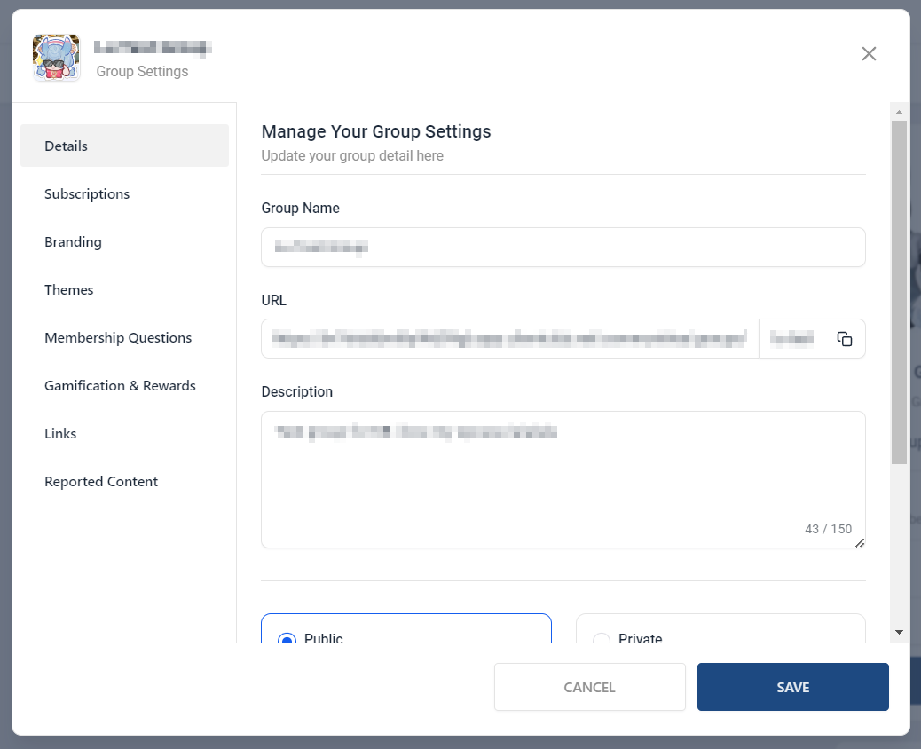 You can access your group settings and make changes to your group by clicking Settings on the right-side menu.
