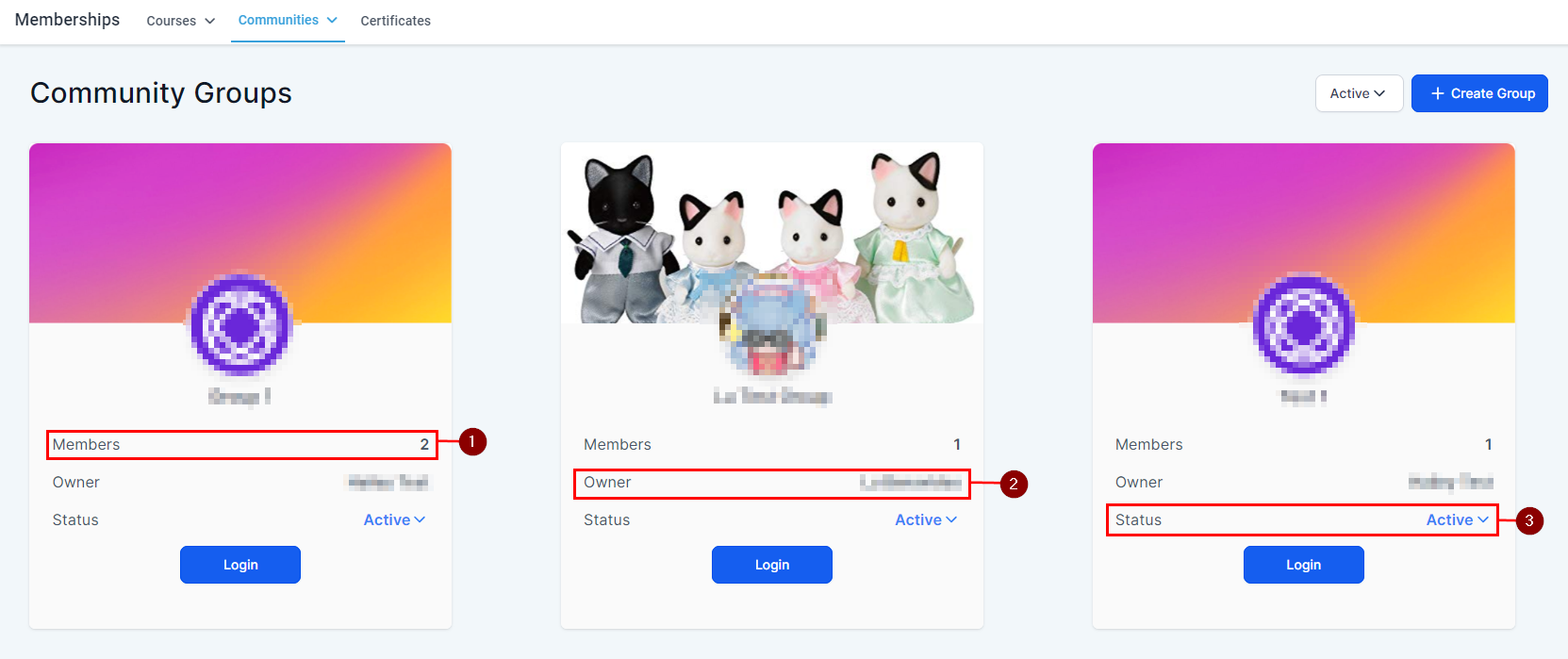 With the Group card you can at a glance check for the total number of members (1), the group's owner (2), and the status of your Group (3).