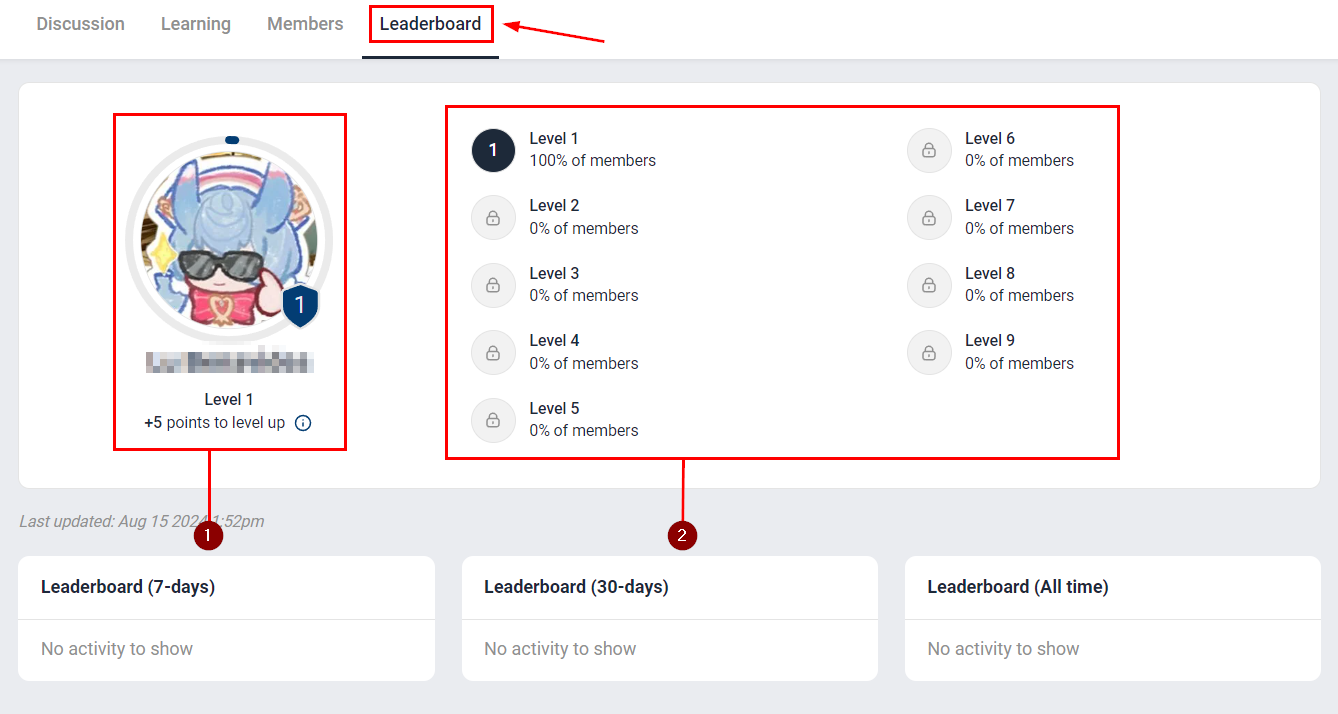 To access the detailed breakdown of your level progression (1) and the level distribution across all group members (2) head over to the Leaderboard tab.