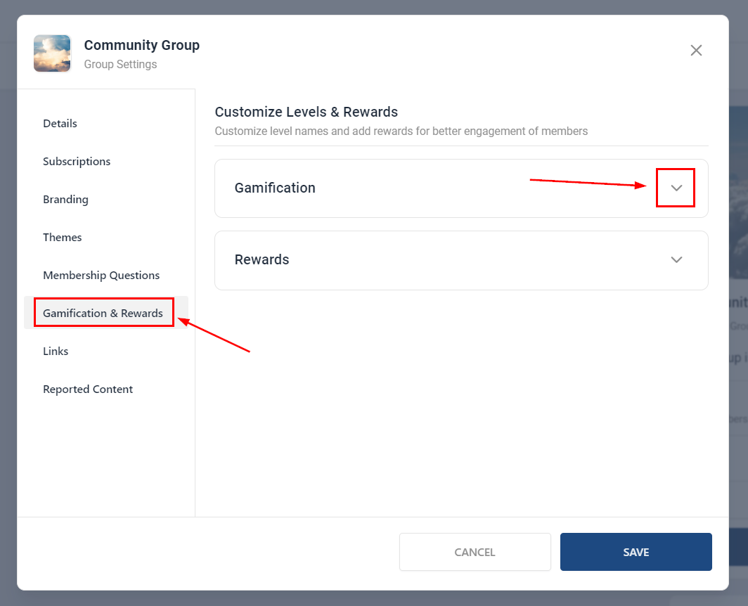 Access the Gamification & Rewards tab and open the Gamification drop-down menu.