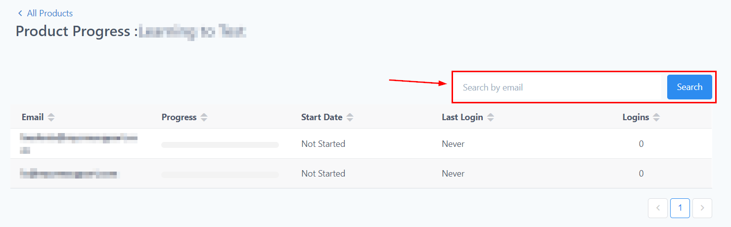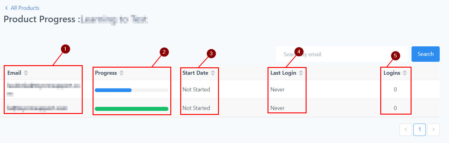 - Progress: In this column, you will see the progress of the product using a percentage; 100% means the visitor viewed the whole module of the product, any percentage lesser than 100% means the visitor hasn't completed the module and a visitor without any percent bar means they haven't opened the product at all.