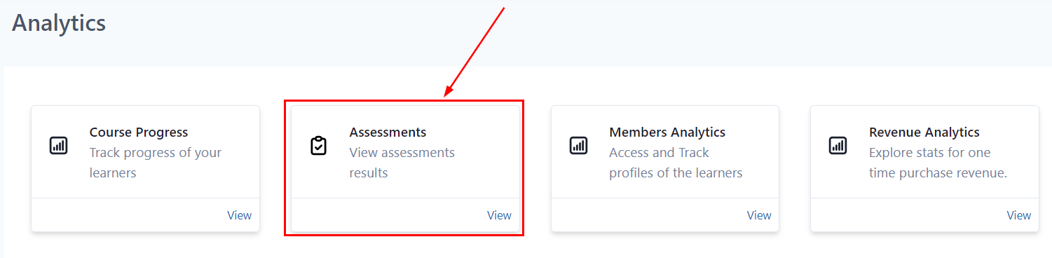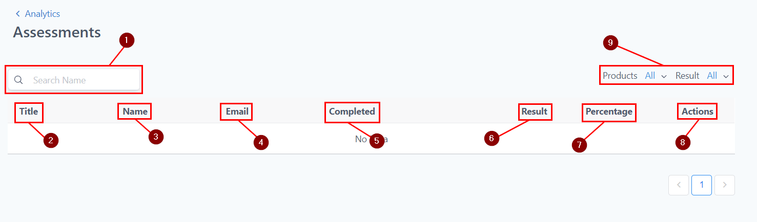 - Filter: You can filter the Analytics for Assessments from a specific product by choosing the dropdown next to Products on the top right or You can also filter Assessment analytics by Results.
