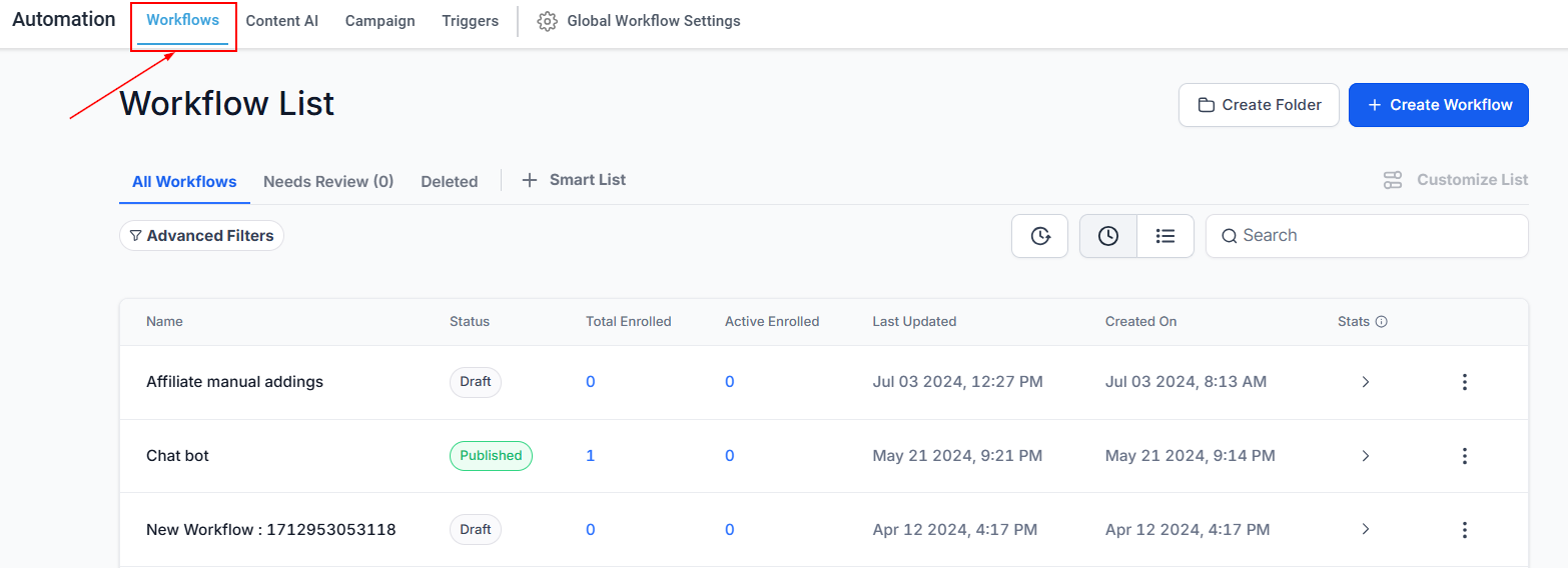 To get started, navigate to the Automation section in your CRM, and Click on the Workflows tab.