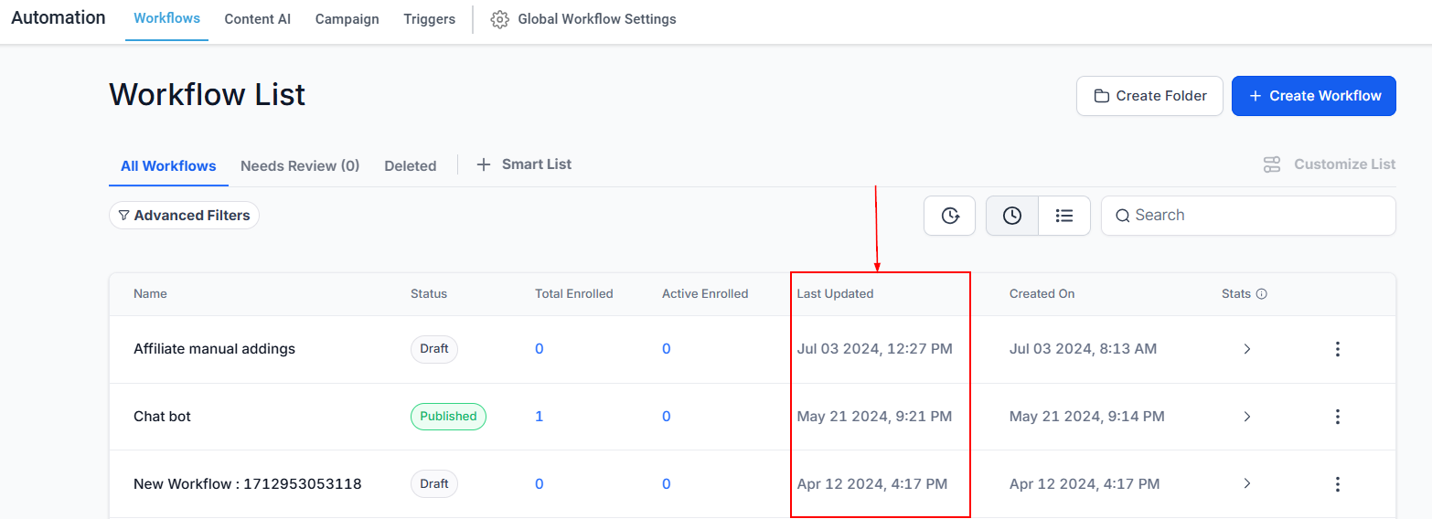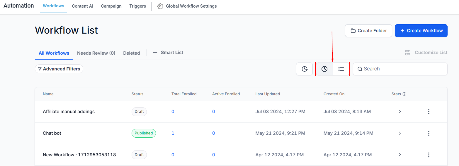 You can sort your workflow list by the most recent updates or in alphabetical order. The Recent option (clock icon) shows the latest updates at the top, while the List view organizes workflows by folders, followed alphabetically.