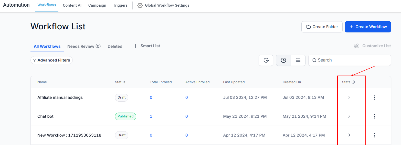 The Stats dropdown allows you to see detailed metrics about your workflows, including Delivered, Opened, Clicked, Replied, and Bounced.