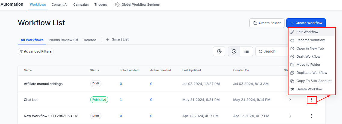 Copy To Sub-Account: Clicking on this option opens up a window where you can choose the Sub-account to want to add this workflow.- Delete Workflow: This button allows you to delete the workflow.