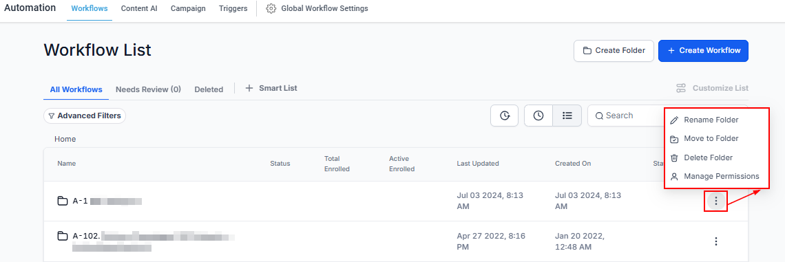- Rename Folder allows you to change the name of a workflow folder. Just click the three dots next to the folder you wish to rename.