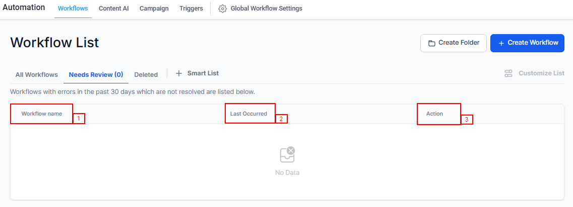 To begin a new workflow, click the +Create Workflow button. This initiates the workflow creation process, allowing you to set up automated actions.