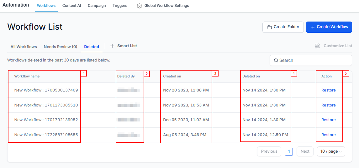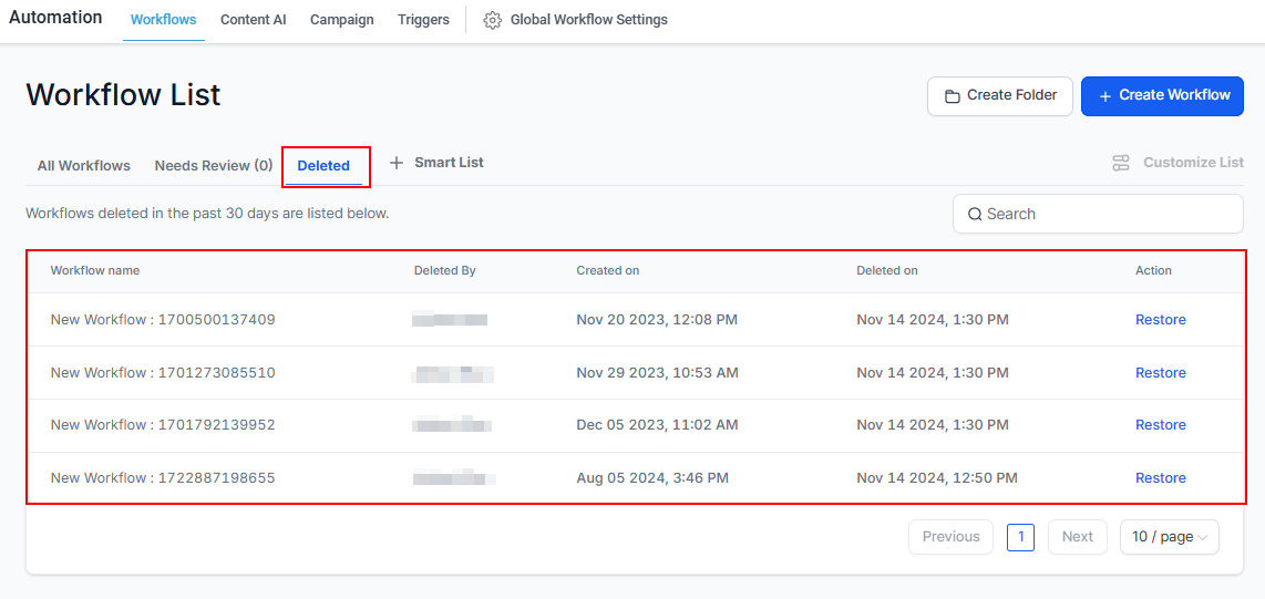 Within this section, you can view and restore workflows that have been deleted within the past 30 days.