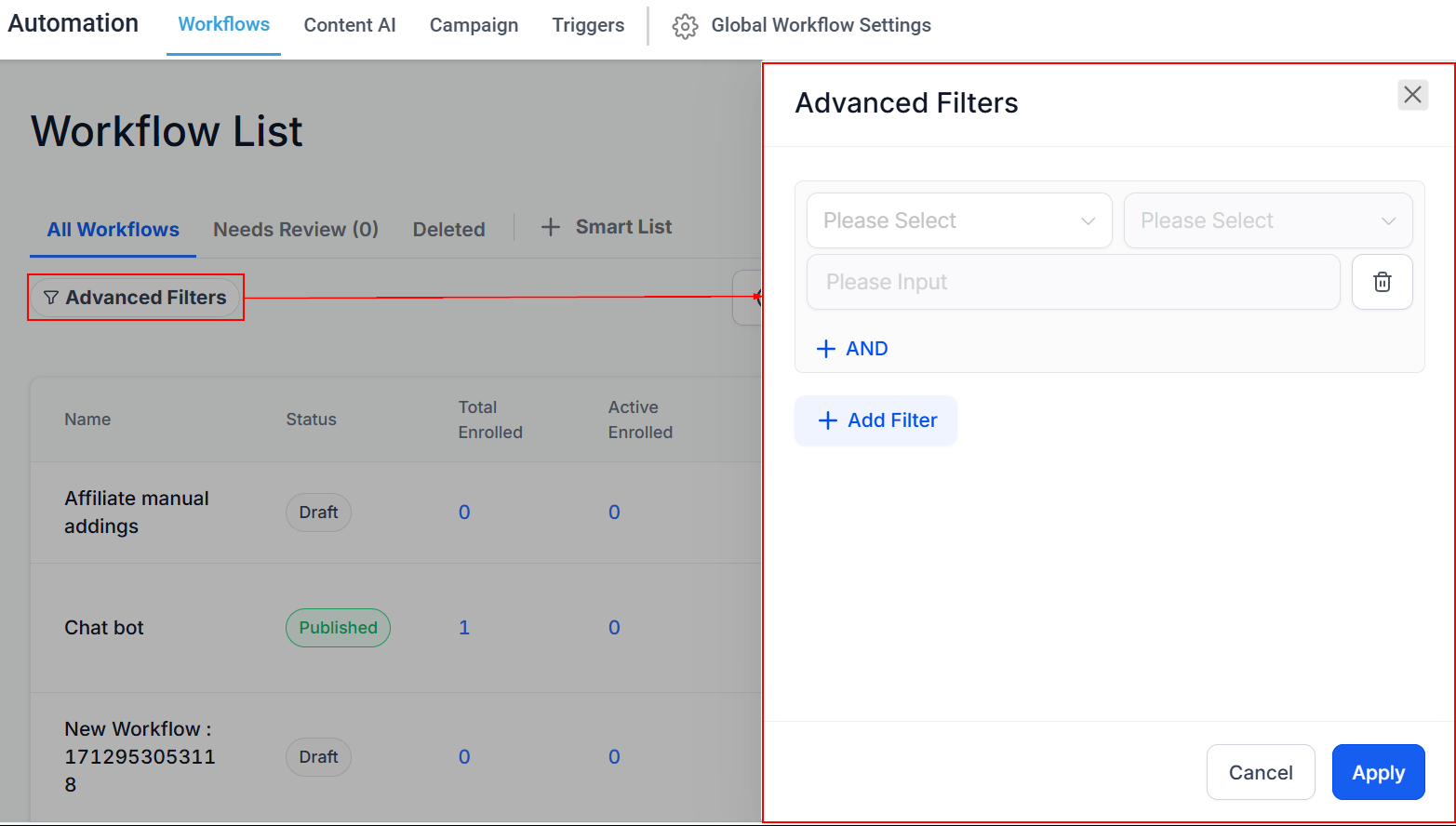 Use advanced filters to narrow down workflows based on specific criteria, making locating the ones you need easier without sifting through the entire list.