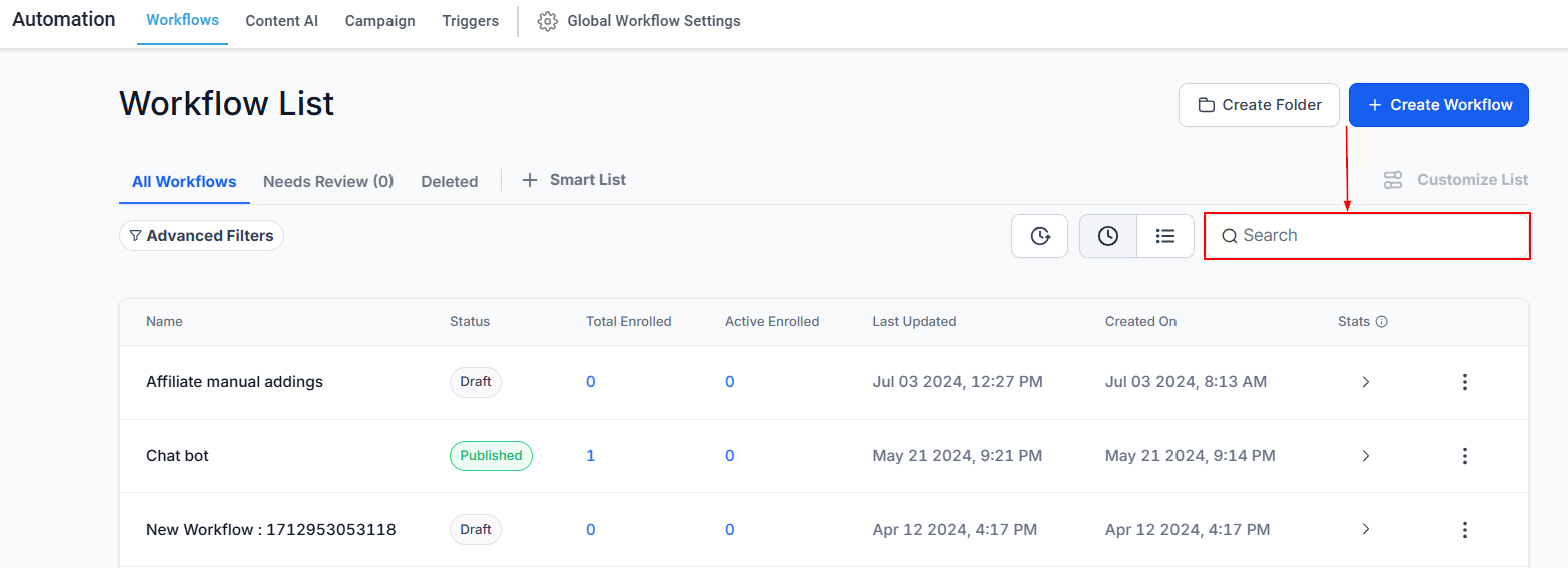 The search bar helps you quickly locate a specific workflow or folder. Type in keywords, and you'll find relevant workflows without the hassle of scrolling through long lists.