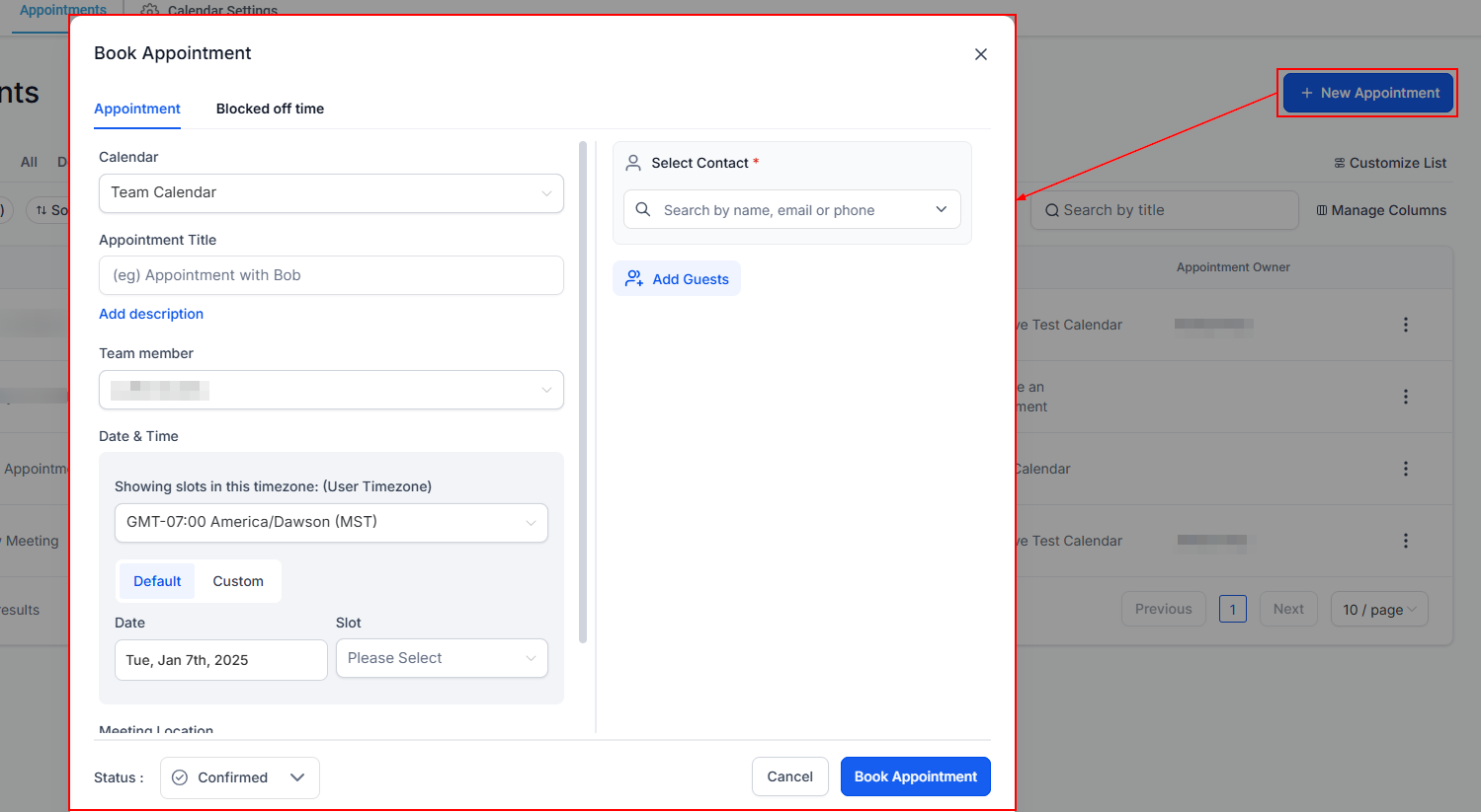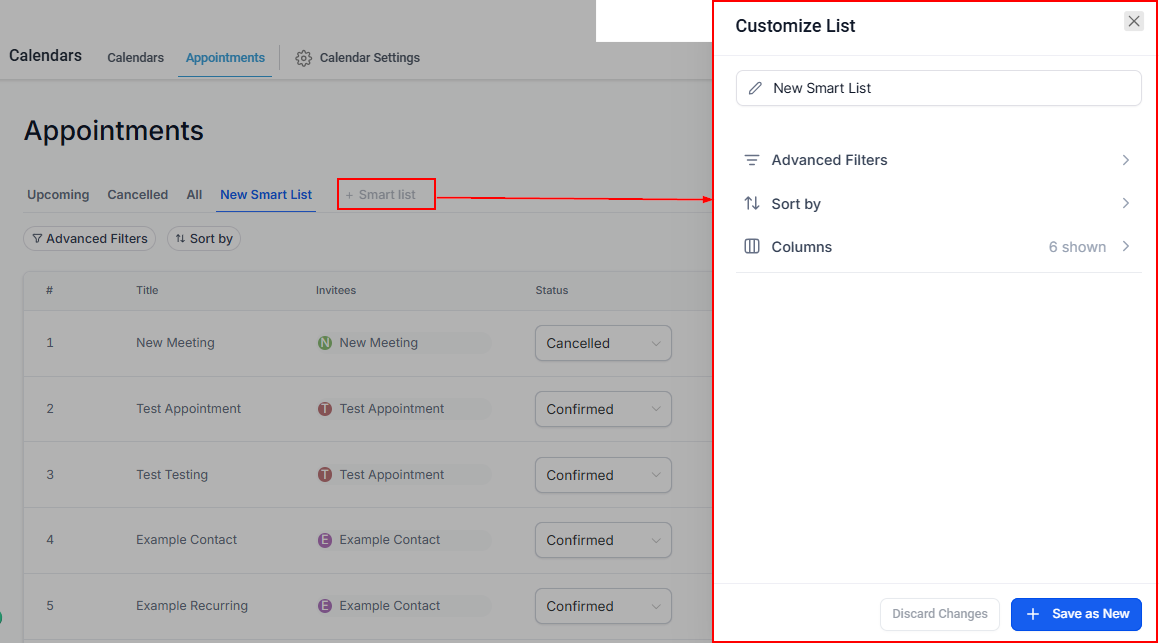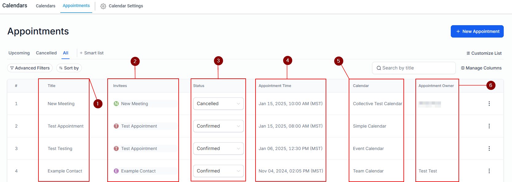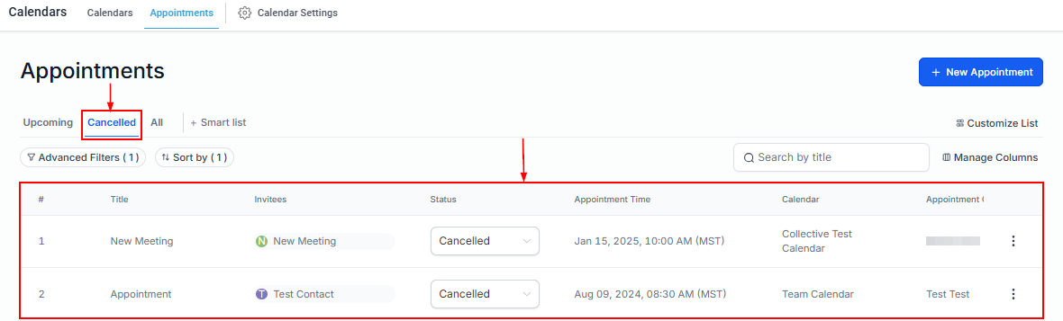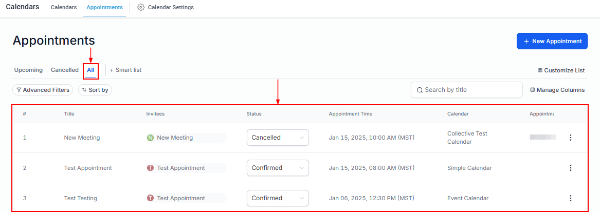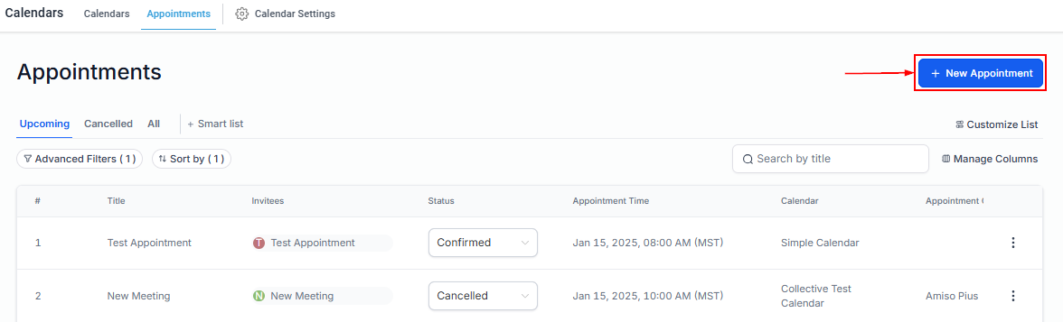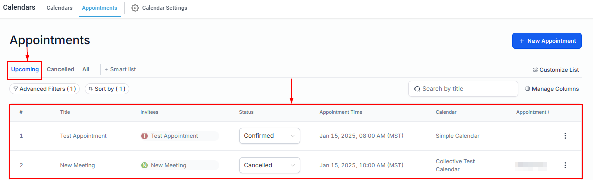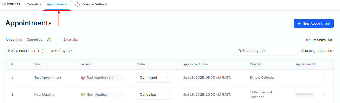 When a meeting is scheduled with you, it will reflect on the CRM calendar. One way you can easily monitor them is by accessing the Appointments tab inside the Calendars section. Here, you will see a list of all the appointments booked through the CRM, whether a customer or a team member books them. You can change the status of appointments and create new bookings in this section.