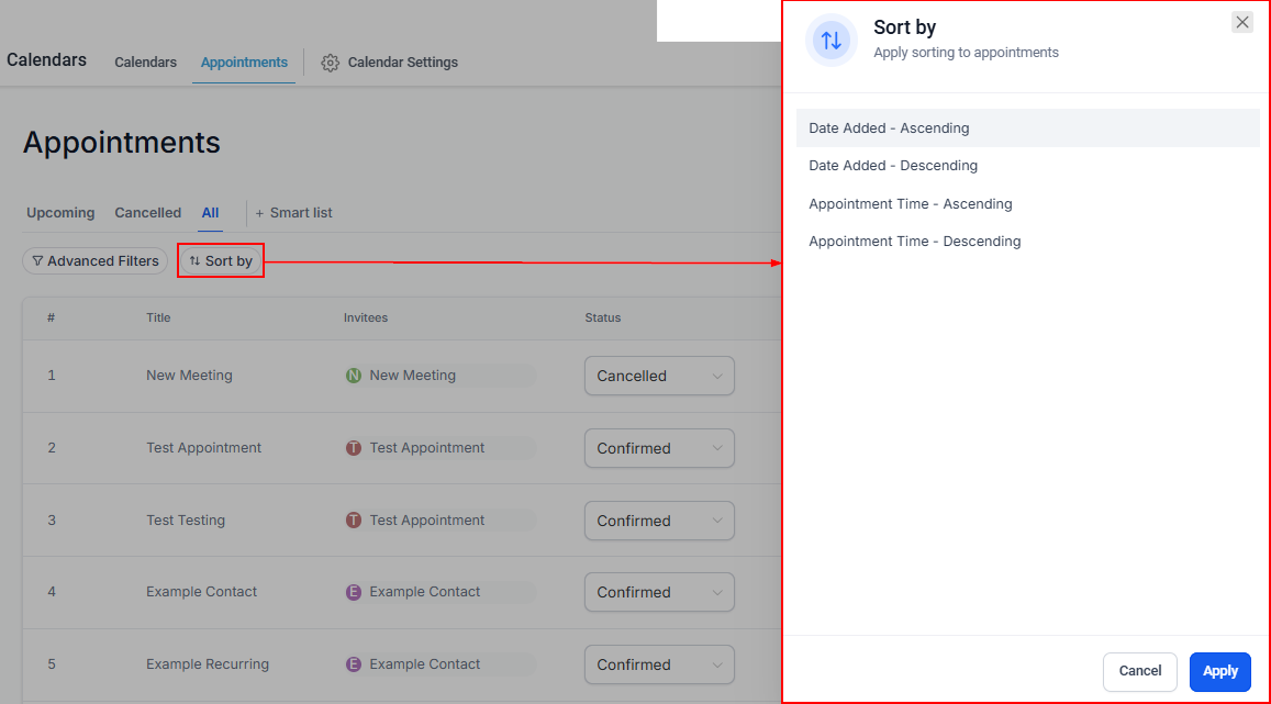 Here, you can sort appointments by “Ascending order” (Display appointments starting from the earliest) or “Descending order” (Display appointments starting from the latest).