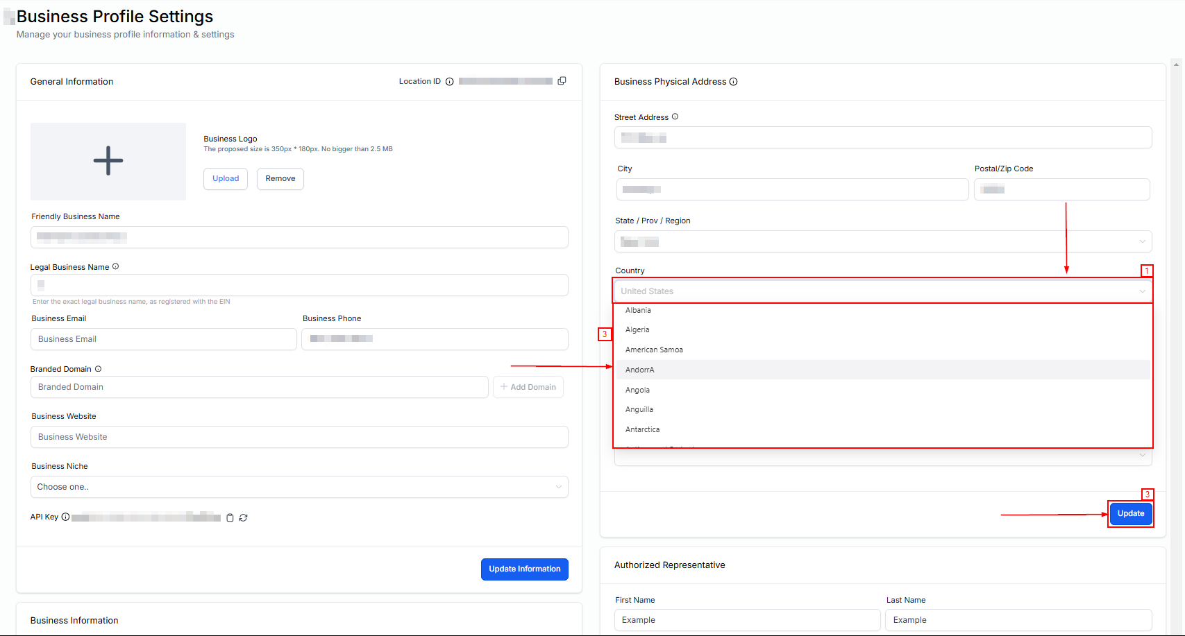 Start by opening the Settings menu, then select Business Info. Here, look for the Country dropdown in the Business Physical Address section. Choose the country that corresponds with the currency you want, and hit Update to save the change.