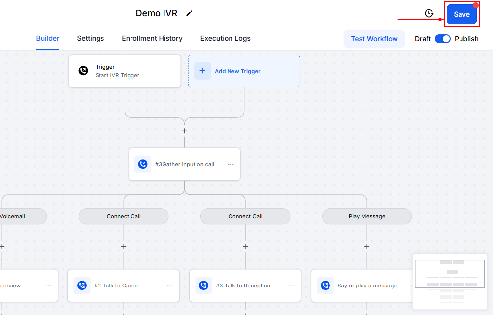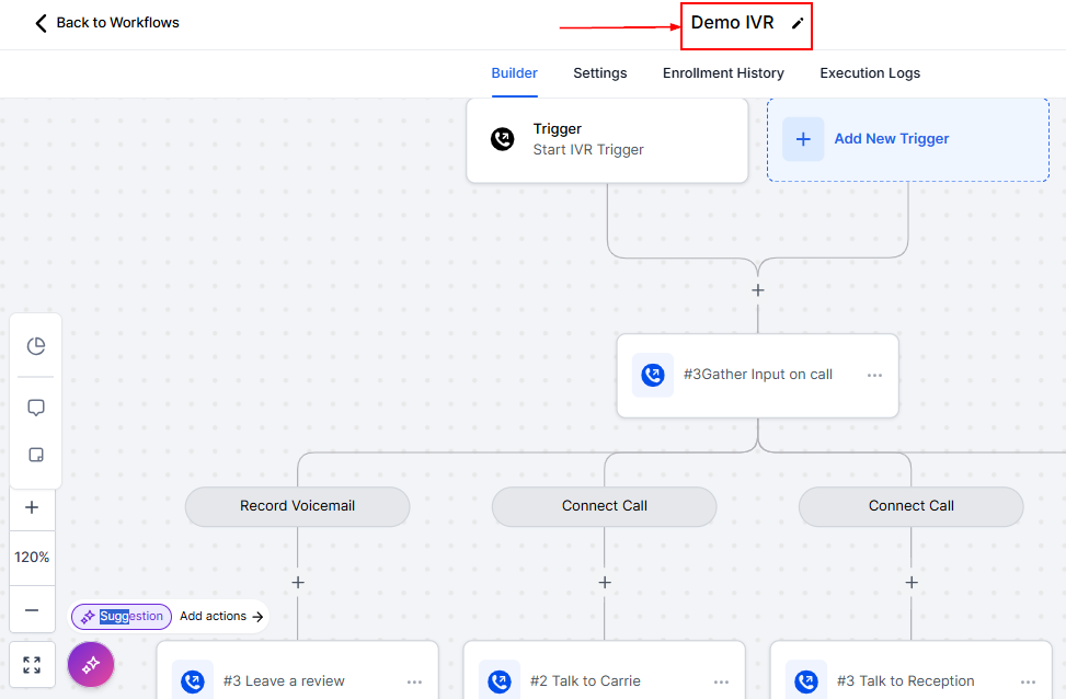 At the top of your Workflow Builder page, you'll find the Workflow Name field. Always name your workflows in a way that reflects their purpose. For example, if the workflow sends a text message to someone who missed a call, you might name it "Missed Call Text-Back." A clear and concise name helps you identify workflows at a glance.