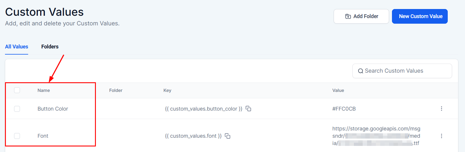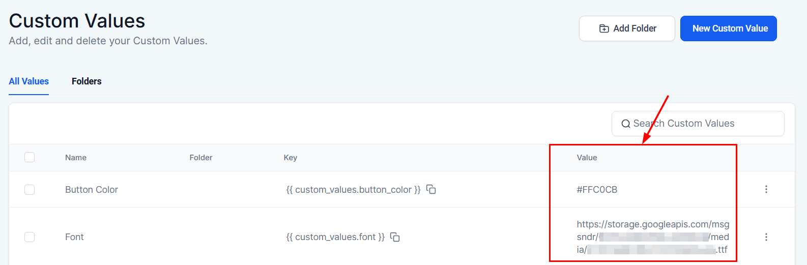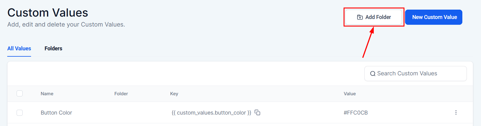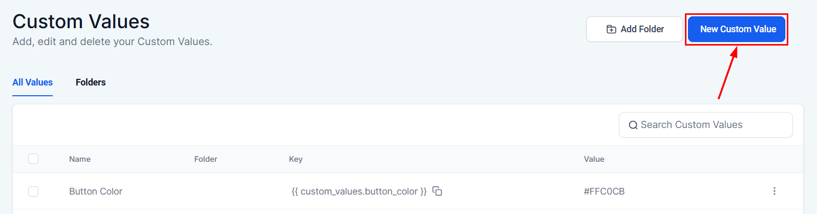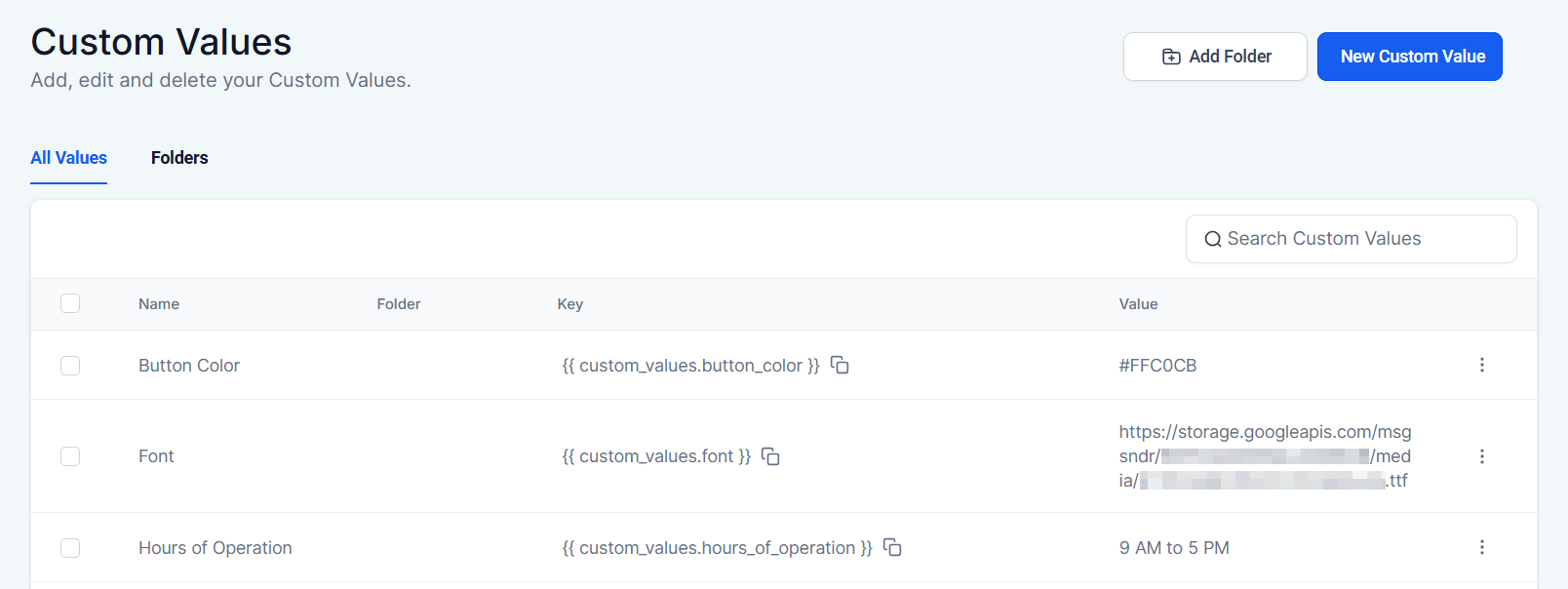 Head to the Settings > Custom Values section in your account to begin.