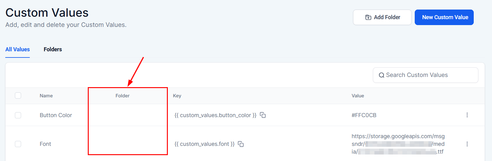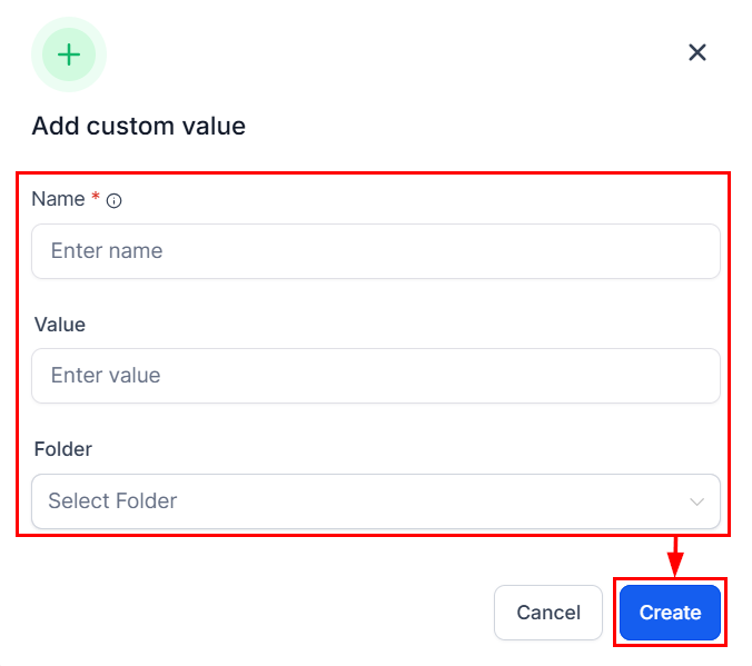 Organize custom values efficiently by creating a new folder within the system. To do so, click the "Add Folder" button located in the top-right corner, enter the desired folder name, and click "Create" to finalize the process.