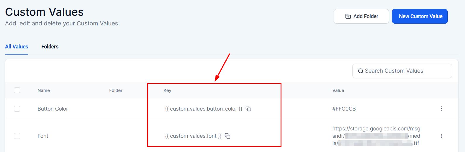 A key represents a distinct, system-generated identifier assigned to each custom value you create. It is essential to reference the specific value displayed in the Key section whenever you need to access or utilize your custom values.