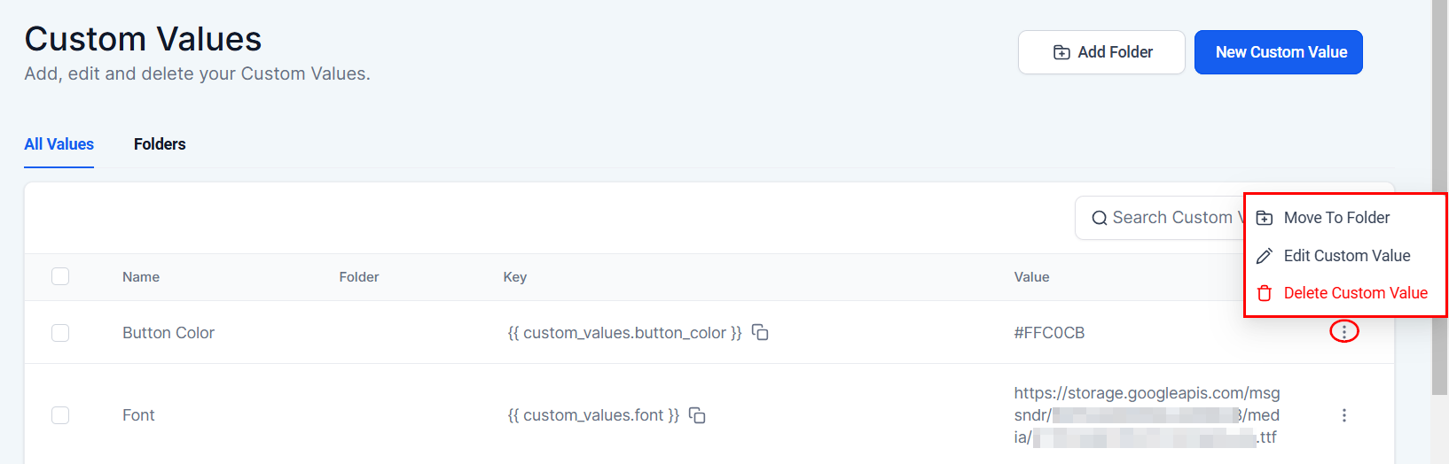 - Edit Custom Value: To edit an existing custom value, click on the “Edit Custom Value” button within the actions dropdown. A pop-up will open for you to edit the name, value, and/or its associated folder. After you have made the necessary adjustments, select “Update” to save.