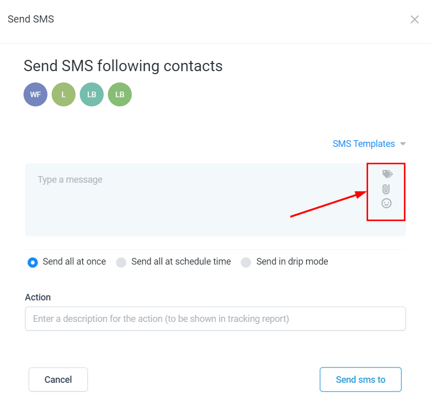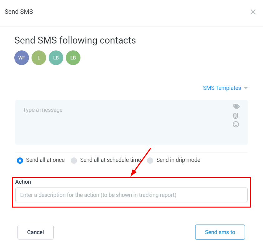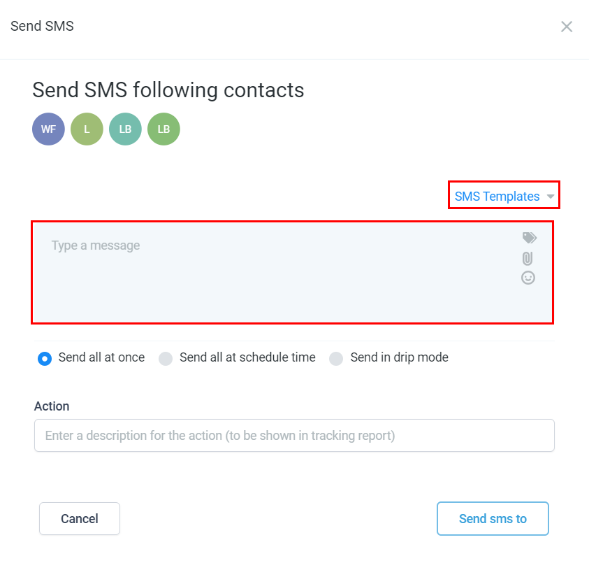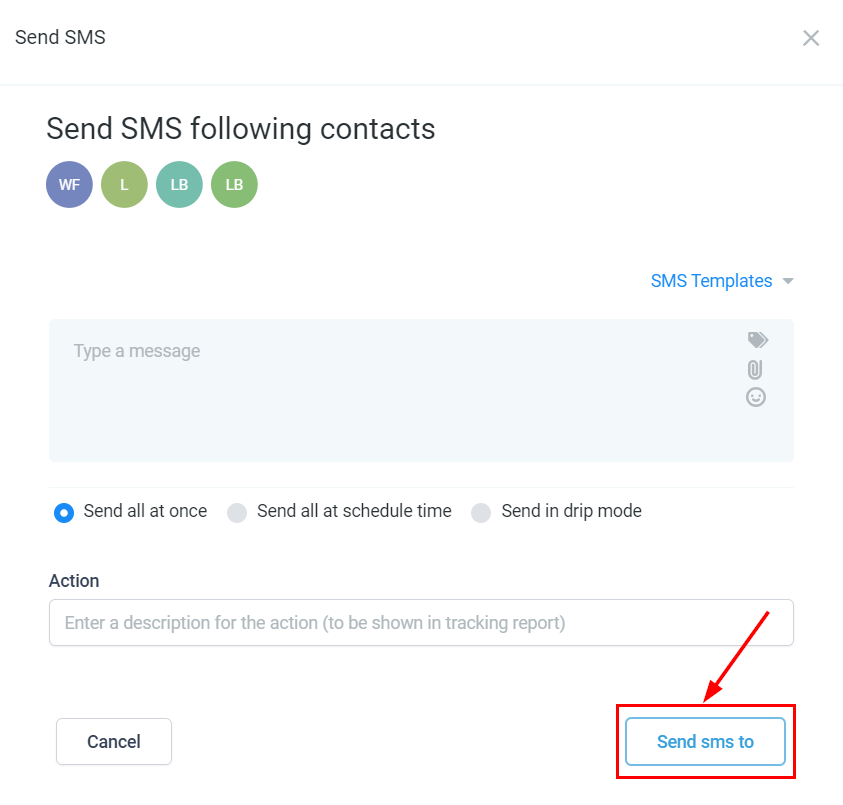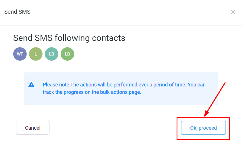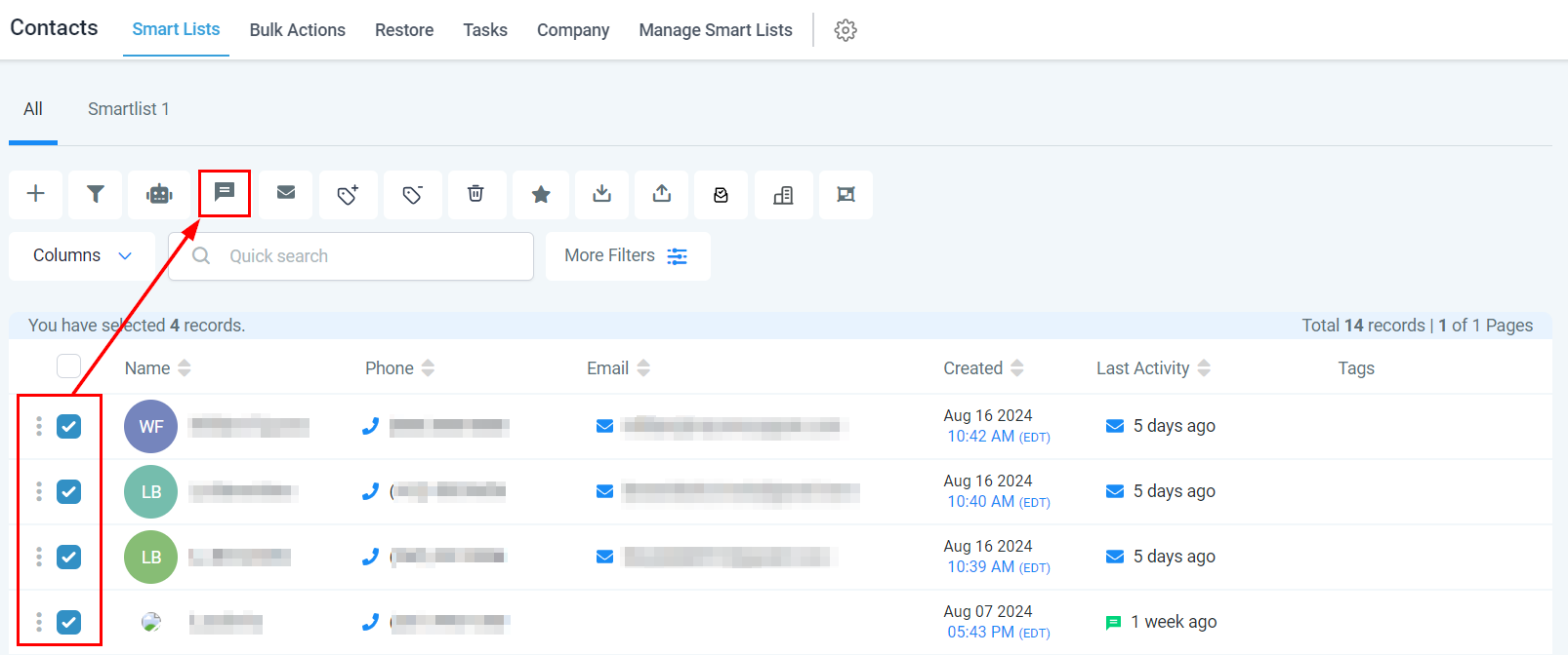 The "Send SMS" bulk action empowers you to efficiently reach multiple contacts with a single message. Simply select the desired contacts within the Contacts tab, and click the "Send SMS" button to begin.