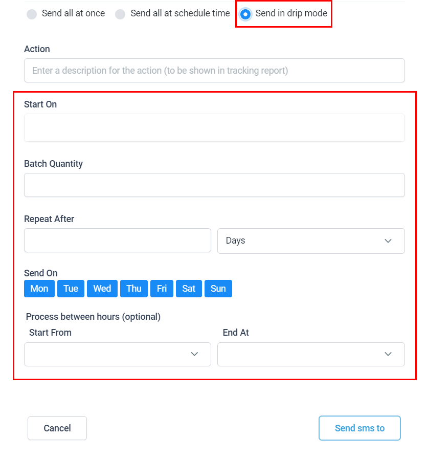 The "Send in Drip Mode" feature allows you to gradually send messages to your contact list in smaller batches over a specified period. This method helps manage responses more effectively and prevents overwhelming your audience. You can control the batch size, set intervals between batches, and schedule specific days and times for sending, ensuring a more targeted and manageable communication strategy.