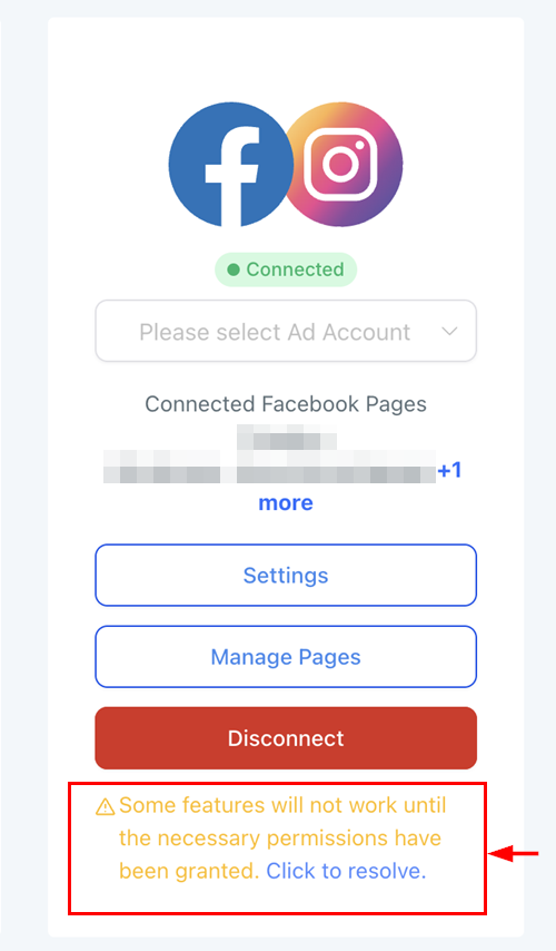 Pages with missing permissions will have an error below the connection. Clicking the Resolve option provides a detailed list of missing permissions for connected pages and the features that are inaccessible due to these missing permissions will be highlighted, giving users a complete understanding of the issue.