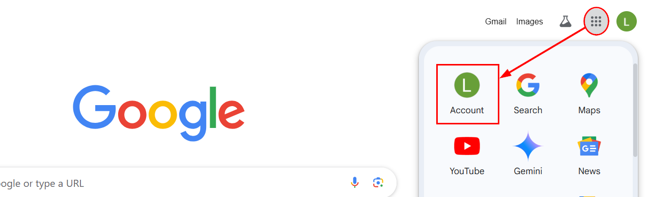 Navigate to your Google account page, click on the 9-dot menu, and select the Account tab.