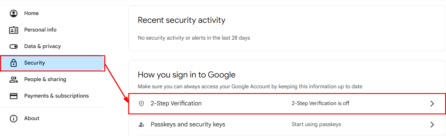From here, navigate to the Security tab. Under the Sign in to Google section, ensure that 2-Step Verification is enabled to safeguard your account. This is required for connecting Gmail with external applications.
