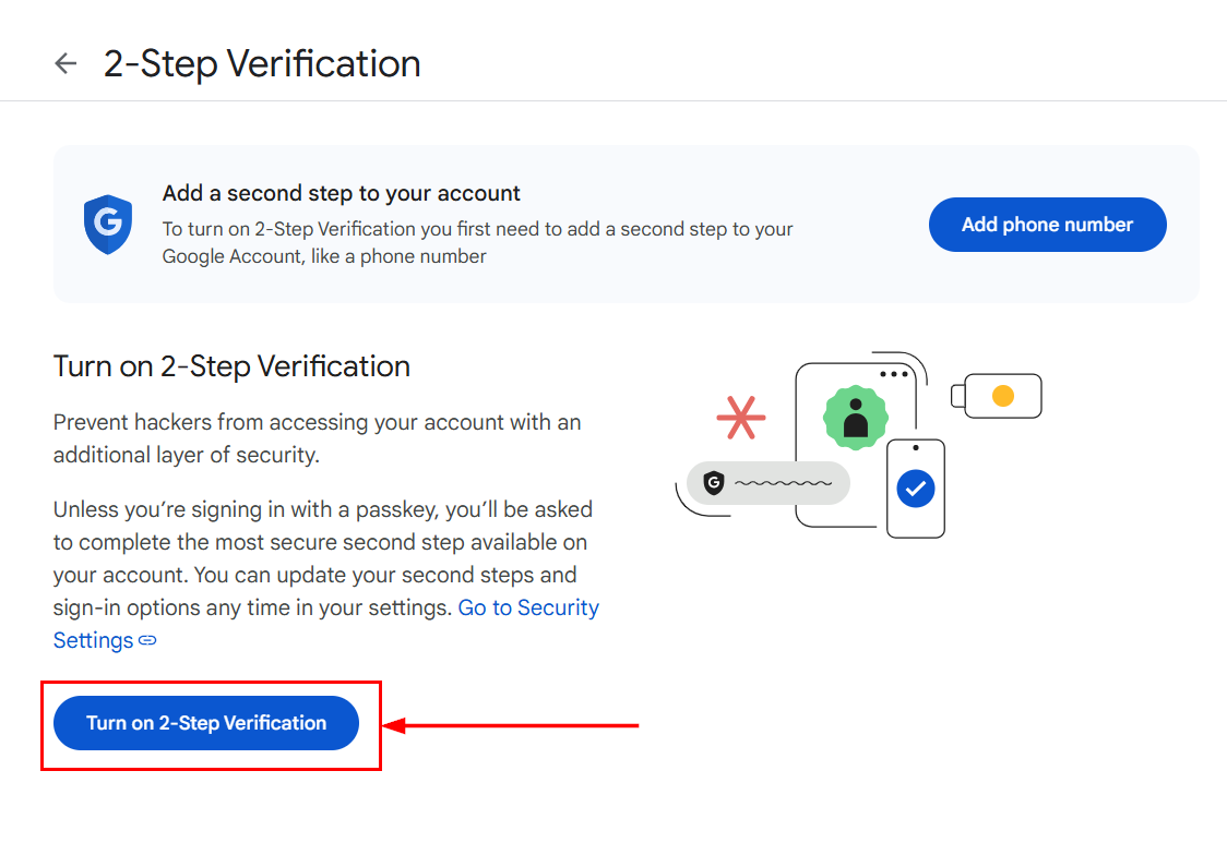 If you do not have 2-step verification enabled, you will see the option to turn it on. Follow the prompts to complete the process.