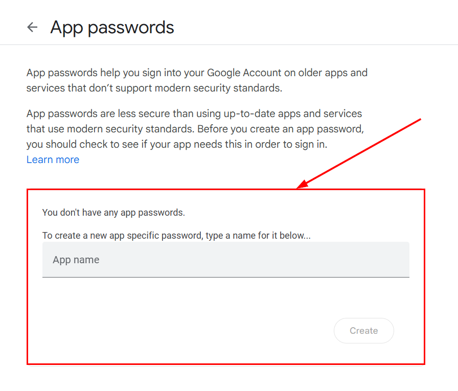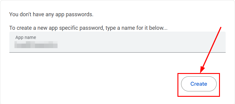 Return to the Security section of your Google account and scroll down to the App Passwords section. Click on the tab, then assign a custom name to the connection for ease of identification.