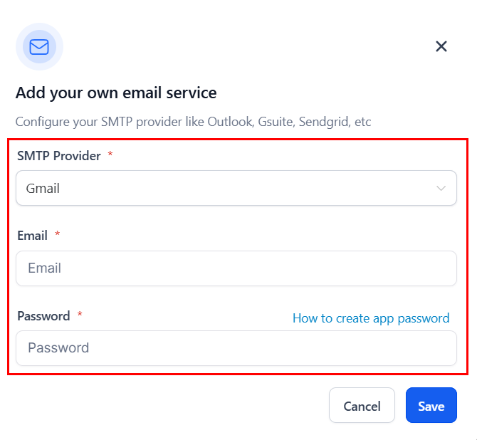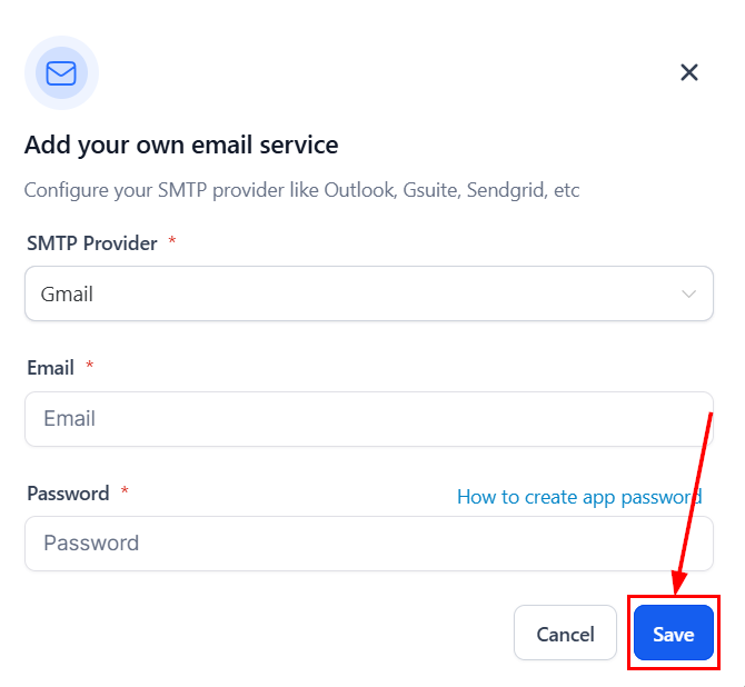 Select Gmail from the SMTP Provider dropdown menu, then enter your email address and the app-specific password into the designated field.