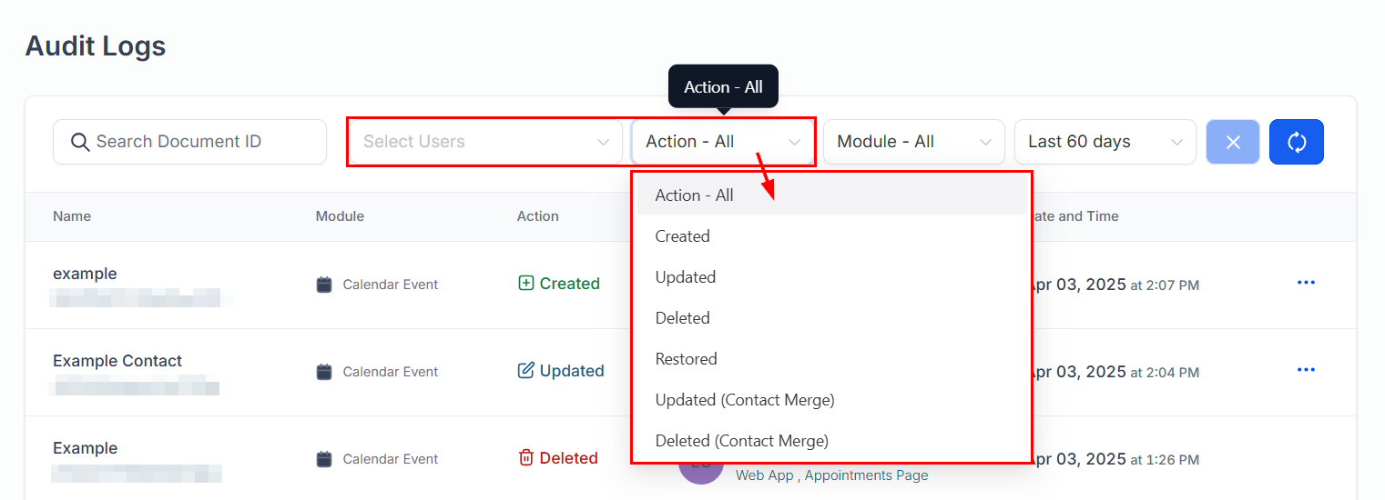Audit Logs provide a record of all activities within the system, they are instrumental in tracking the source of changes, ensuring data integrity, and making troubleshooting easy. For the Calendars, they also help you view extra information about the appointments or changes to them. This helps keep accountability across team members and saves any missing appointments and their information.