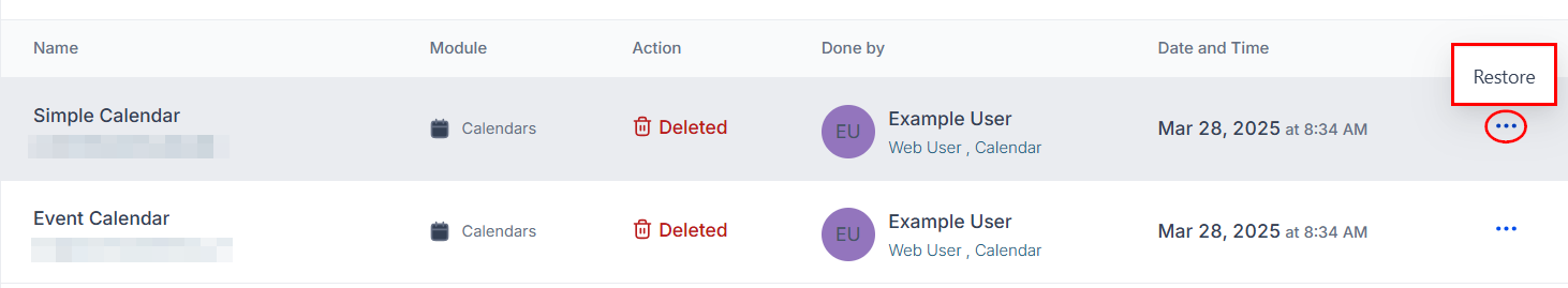 Have you ever accidentally deleted a Calendar? There's nothing to worry about. Inside the Audit Logs, you can recover deleted calendars, along with their appointments, by clicking on the three-dot icon next to the log entry and selecting Restore.