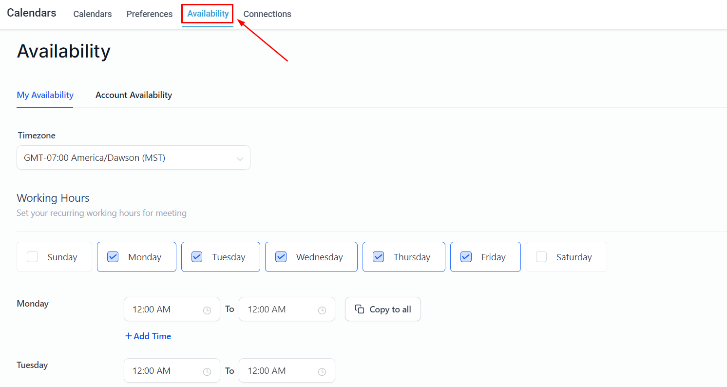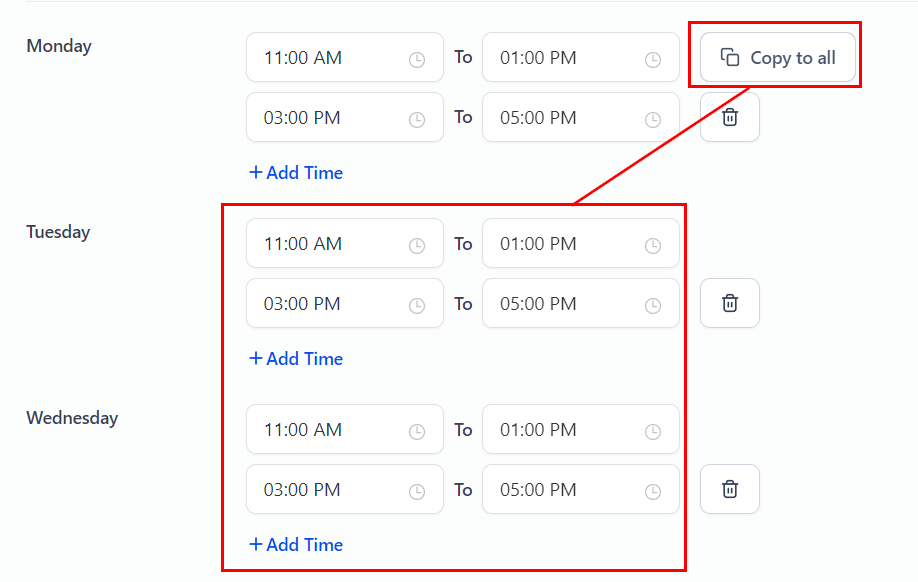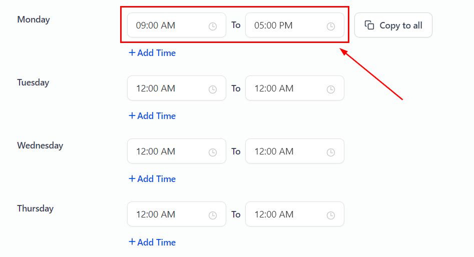 If your schedule is the same every day, once you've set the working hours for the first day of the week use the "Copy to all" option to apply them to other selected weekdays.