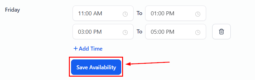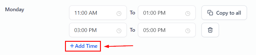If you would like to split your working hours into two or more parts, you can use this option. For example, for the first half, you will accept appointments from 11:00 AM to 1:00 PM then take a break and come back later, for the second half, you will set the time as 3:00 PM to 5:00 PM, leaving a gap that will not be available for appointments.