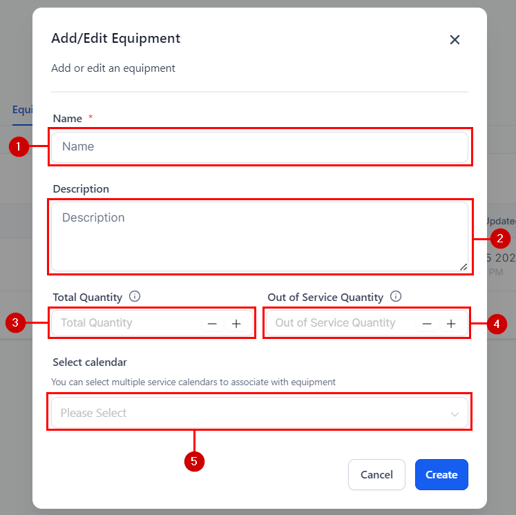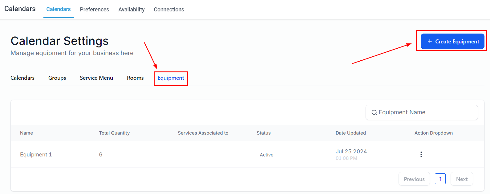 Start by selecting the Equipment tab and clicking “+ Create Equipment”, it can be any tool, device, or machine you use to deliver your services.