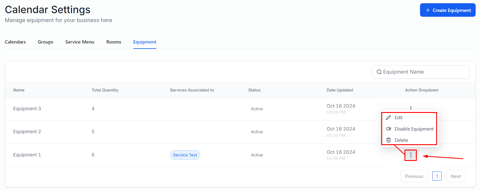 Click the three dots icon under Action Dropdown to change a room or equipment. There you can select between: