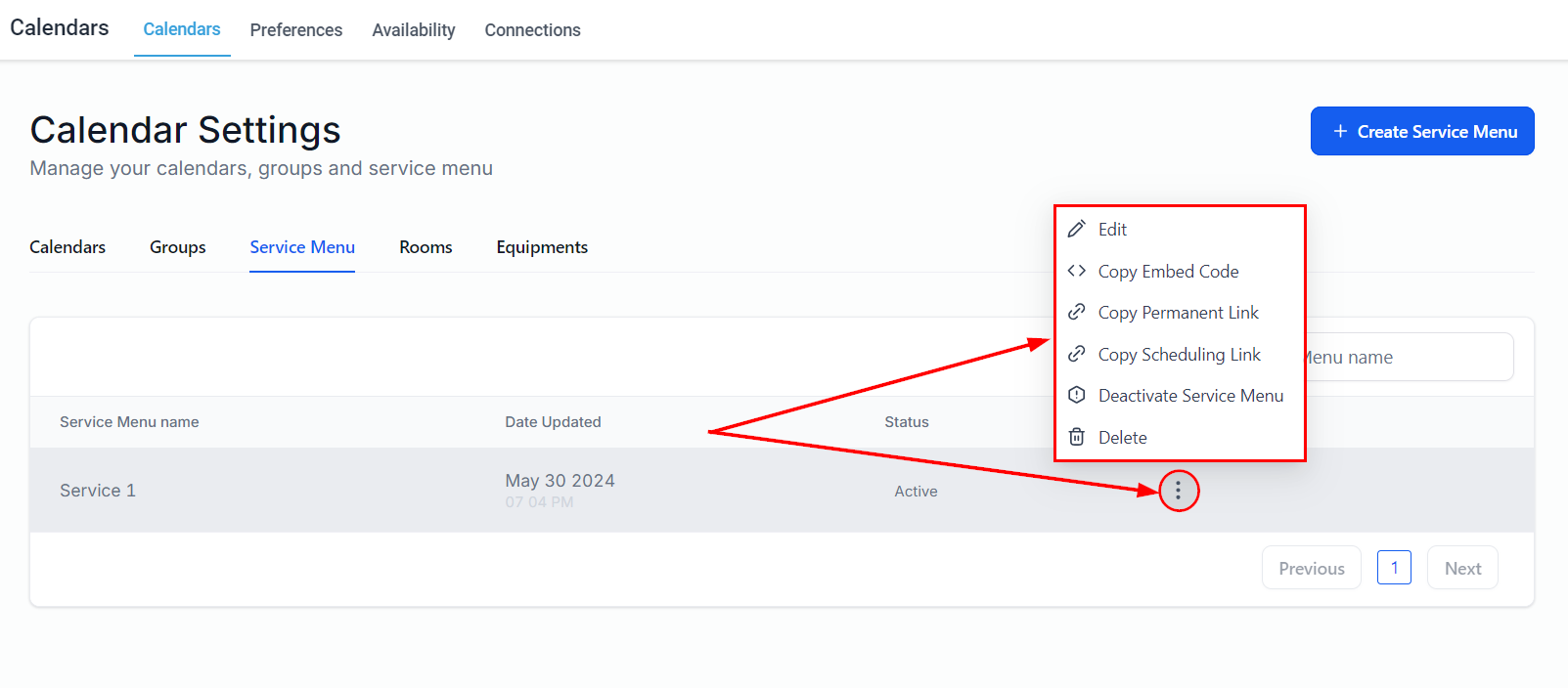 - Delete: This button removes the selected service menu from the calendar, ensuring it will no longer appear for booking.