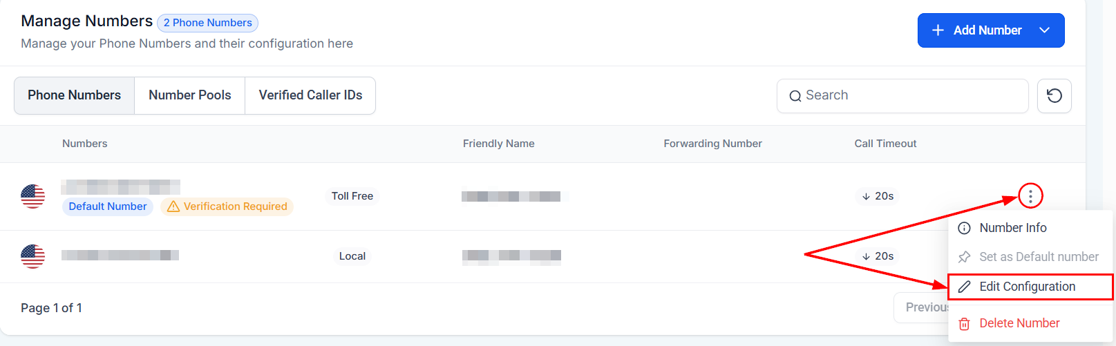 To turn on call recording, go to Settings in the bottom left-hand corner & then find Phone Numbers. Click the 3-dot icon corresponding to the number for which you wish to enable call recording, then select Edit Configuration.