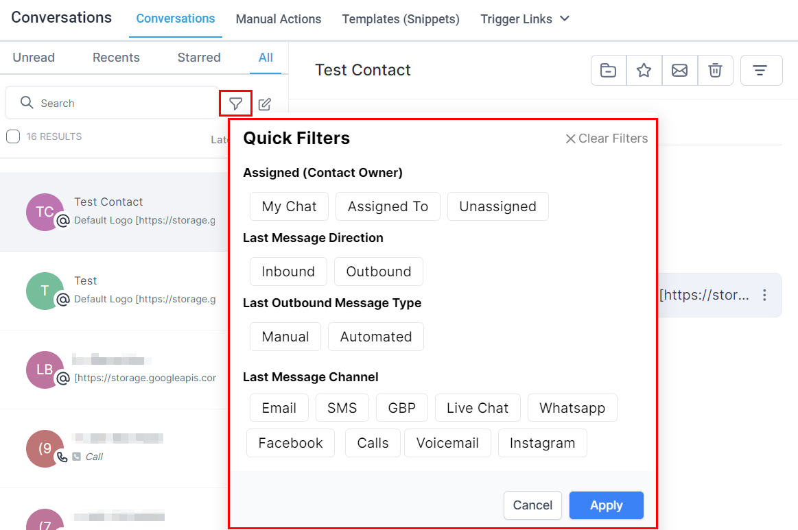 - Filter: Apply filters to view conversations based on specific communication channels or particular activities within the contact record.