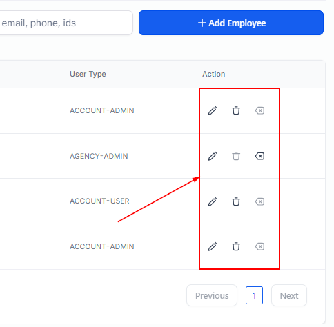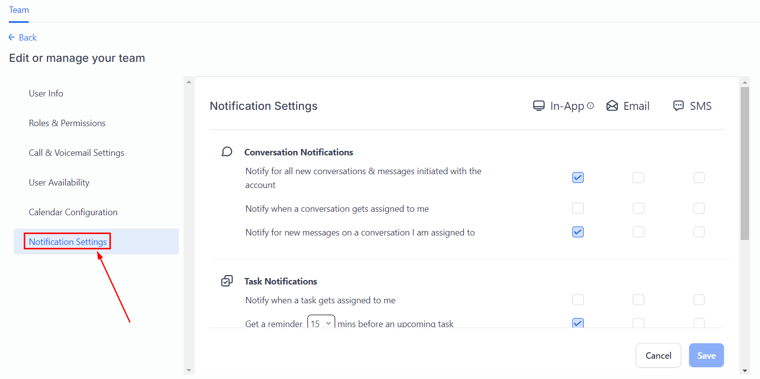 To edit a team member, click the pencil icon to the right of the contact you want to edit. A popup will appear for you to edit the contact information including user info, permissions, roles, call & voicemail settings, availability, and calendar configuration. You can also remove a team member from this location/sub-account with the crossed-out tag icon, or delete a team member with the trash can icon.