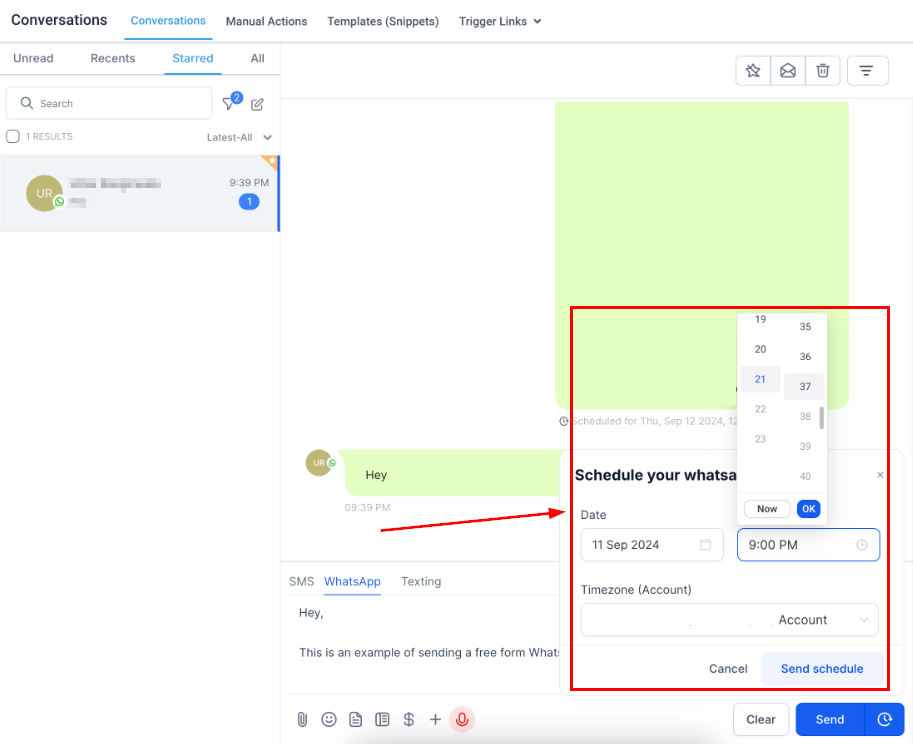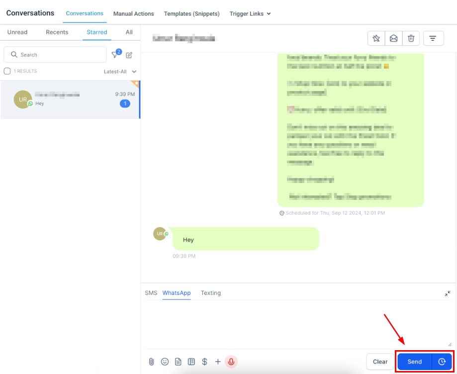 Once your message you can click on Send to directly message your client or click the clock icon to schedule the message for later.