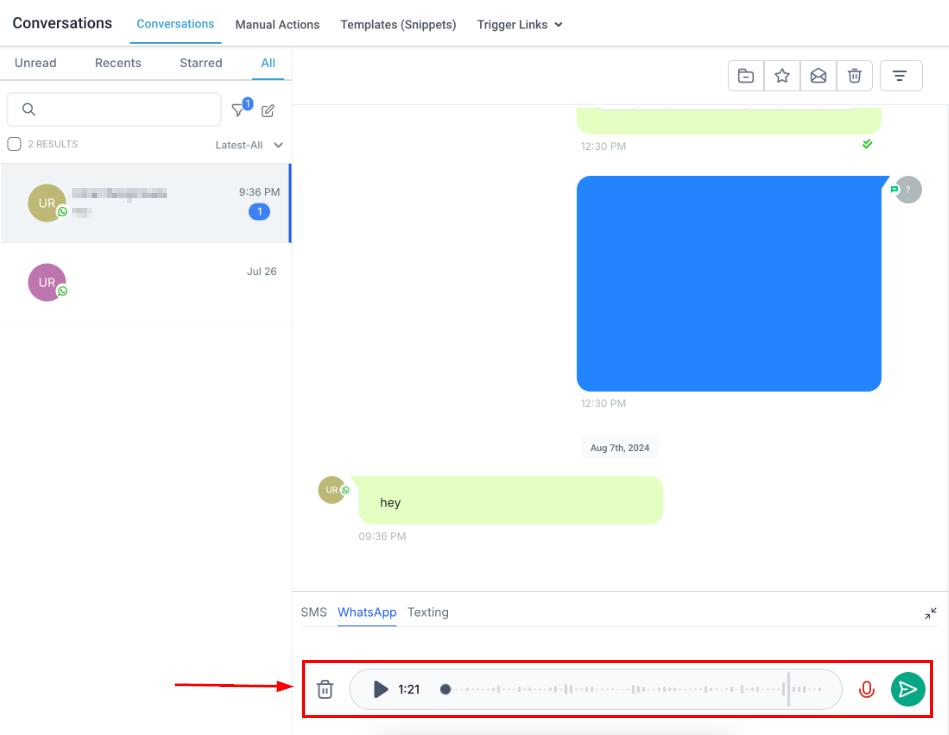 Just like with Facebook and Instagram messages, the contact should have sent you a message in the last 24 hours for you to be able to reply with WhatsApp. Other than that it works the same as any short message, you can include links, media, and custom values to spice up your text and use this tool to maximize your responses!