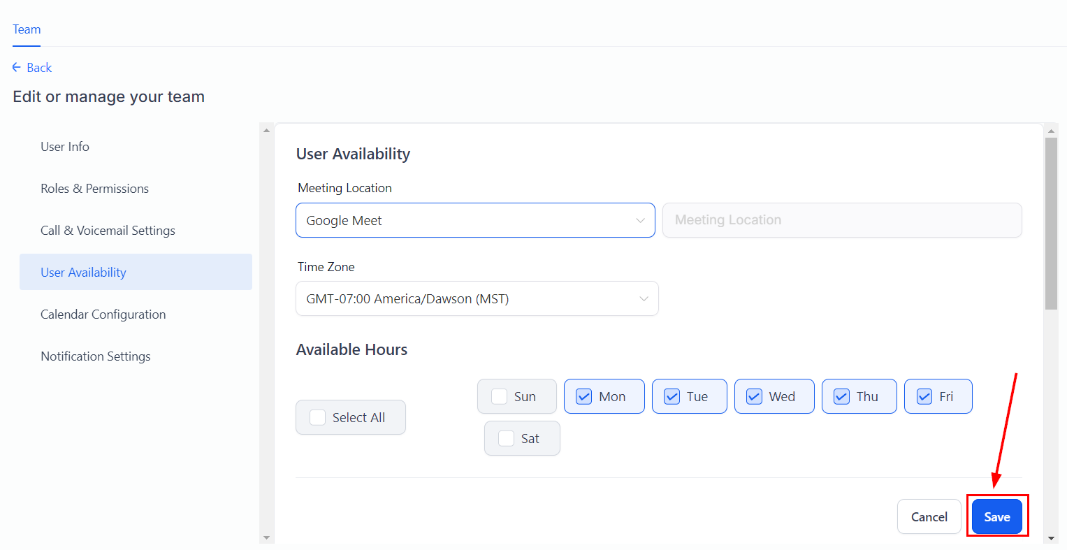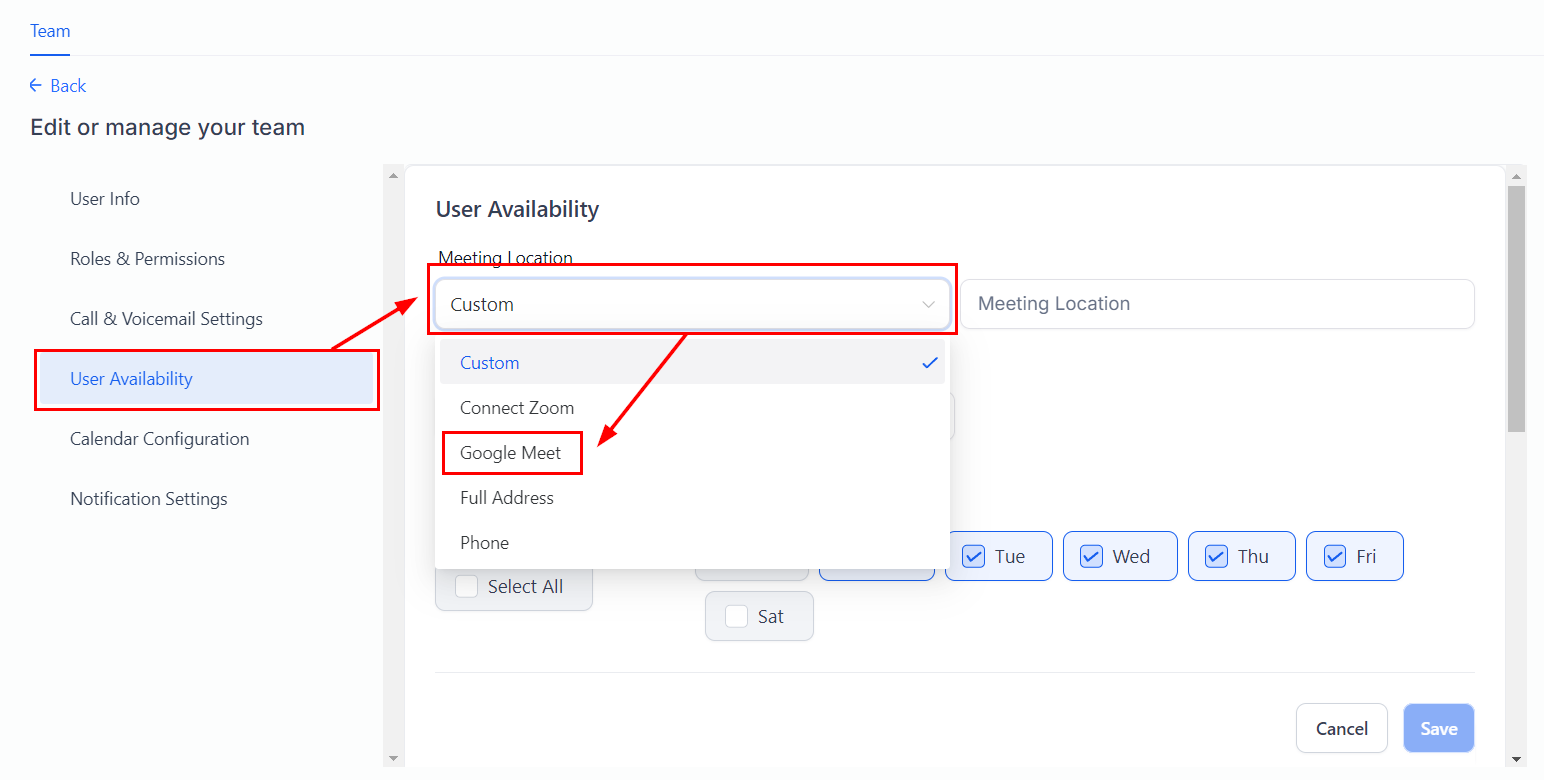 - Go to the section labeled User Availability. In the dropdown menu for meeting location, select Google Meet as your preferred location.