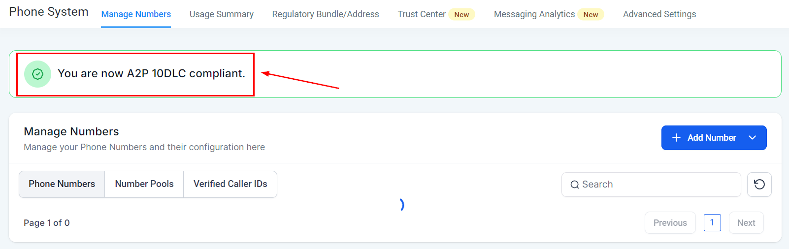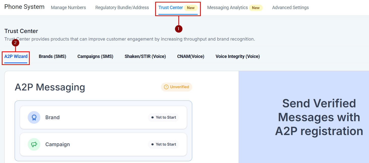 Navigate to the Trust Center tab inside the Phone Numbers section.