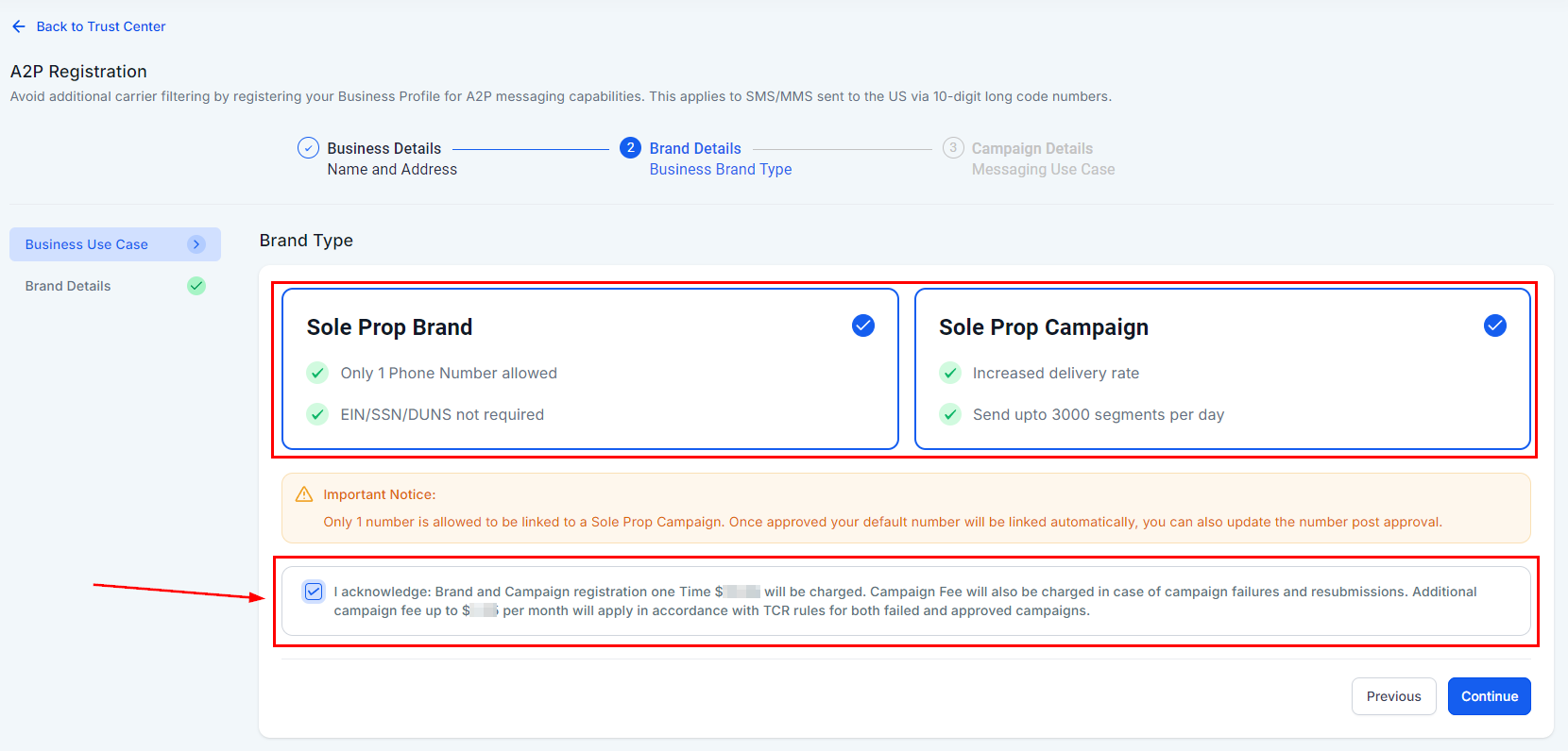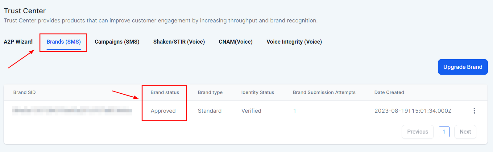 The brand should become verified (or rejected) within a maximum of 24 hours after submission. Once the brand is approved, you might need to resubmit your Campaign for approval. You can verify your brand's approval under Brand (SMS). For Sole Proprietors, a text message from The Campaign Registry (TCR) will be sent immediately on submission. Reply Yes to this text message for your brand to become approved.