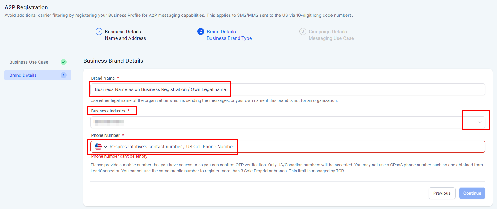 - Ensure all required fields are accurately filled out and resubmit your A2P application for review. Double-check your business information for any errors or omissions.