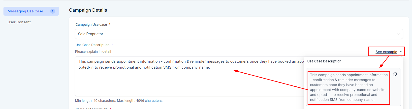 Your campaign details will explain why and how you will use this phone number. By clicking on See Example, you can reference the text to create your own. Make sure that if the text is a variable, such as a name, you include it in brackets like this [Bob] and that you replace things like company_name with your actual information.