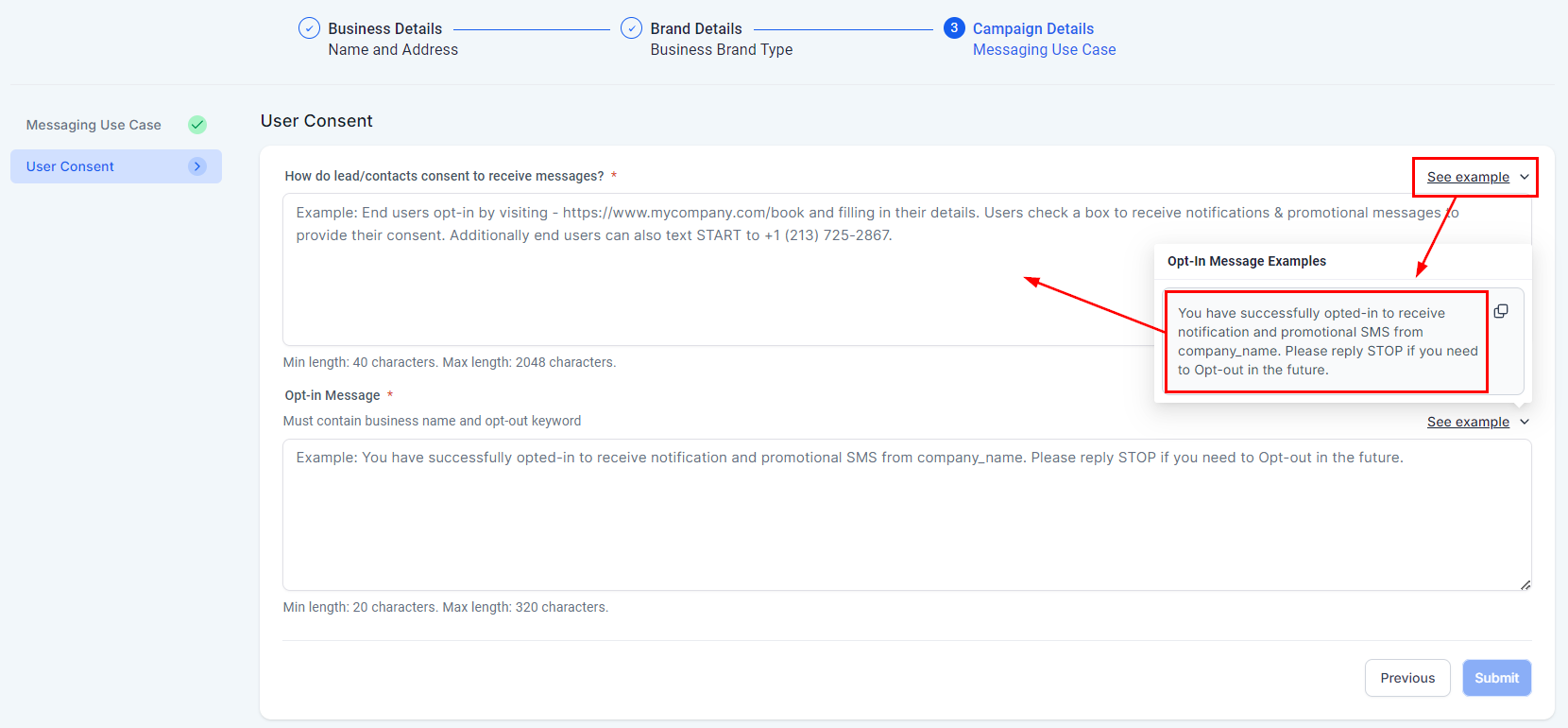 Fill out the boxes with examples of how your contacts can consent and opt-in for contact, here you can use the system-provided examples as a base for your message but they must include a functional opt-in form with terms and conditions that uses the same domain as your business website, a contact Phone number and a way for contacts to opt-out of your messages.