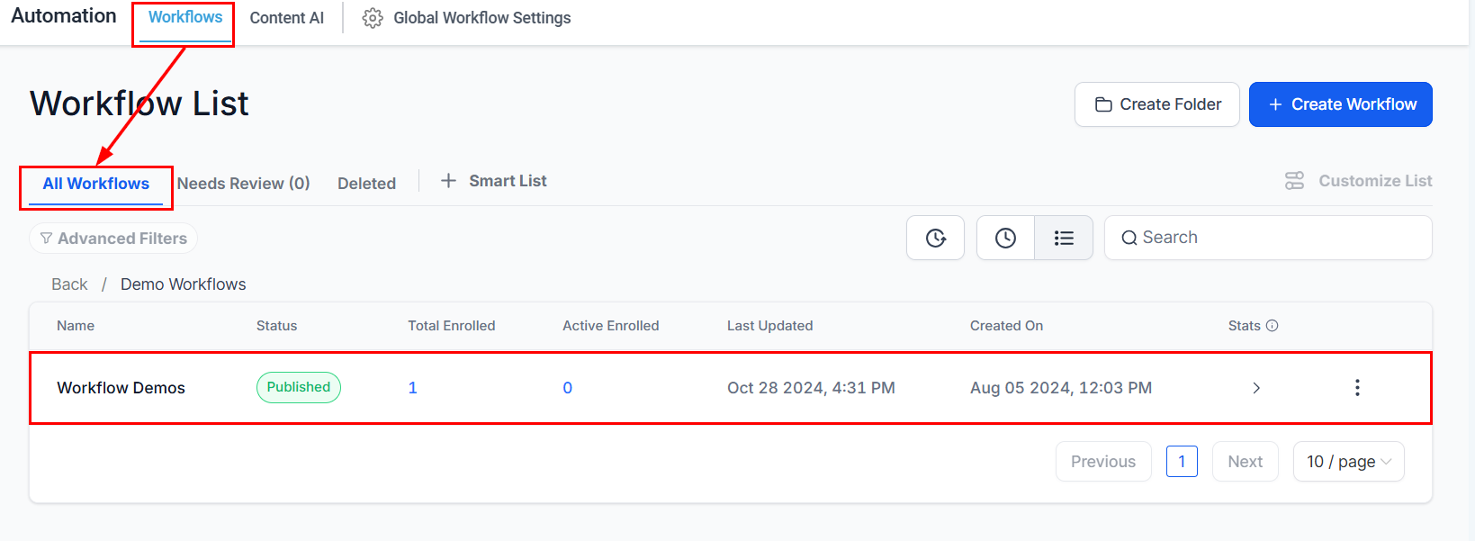 Head to the Automation > Workflows section in your account, then select an existing workflow or create a new one to begin.